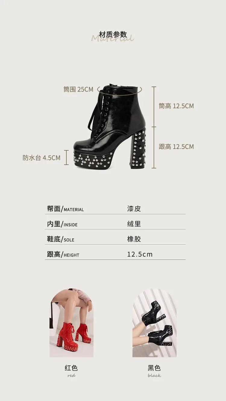 US Size 15 Large Size 48 for Big Feet Women's New Short Boots Lace up With Rivets Stud Platform Shoes Heels Chunky Booties