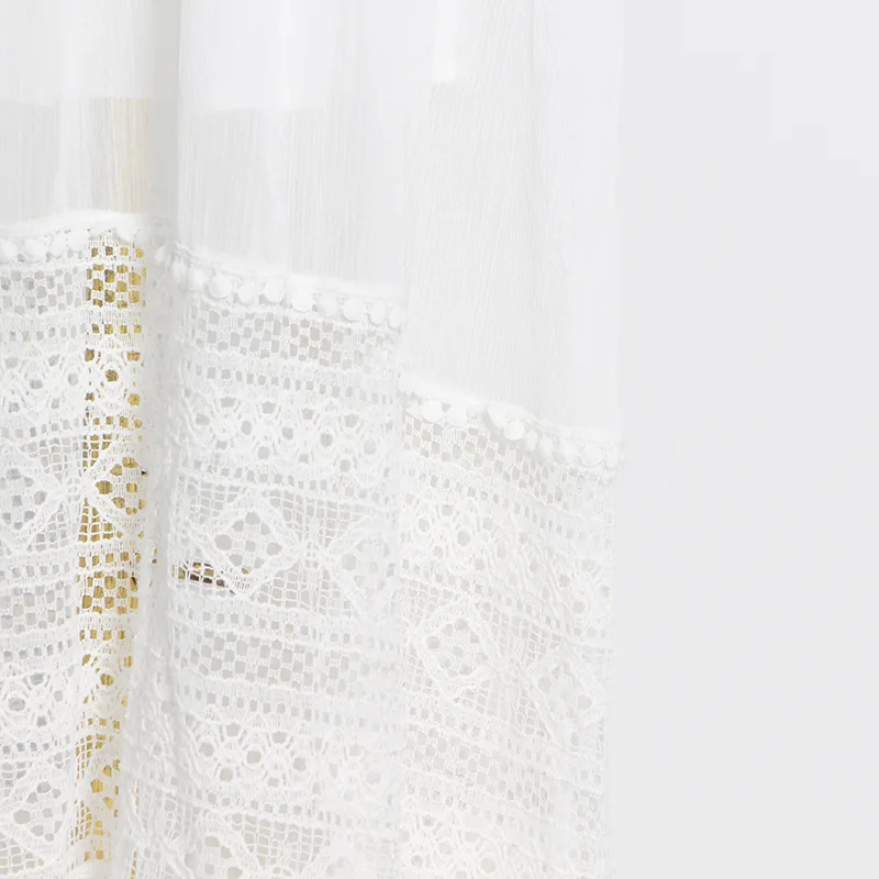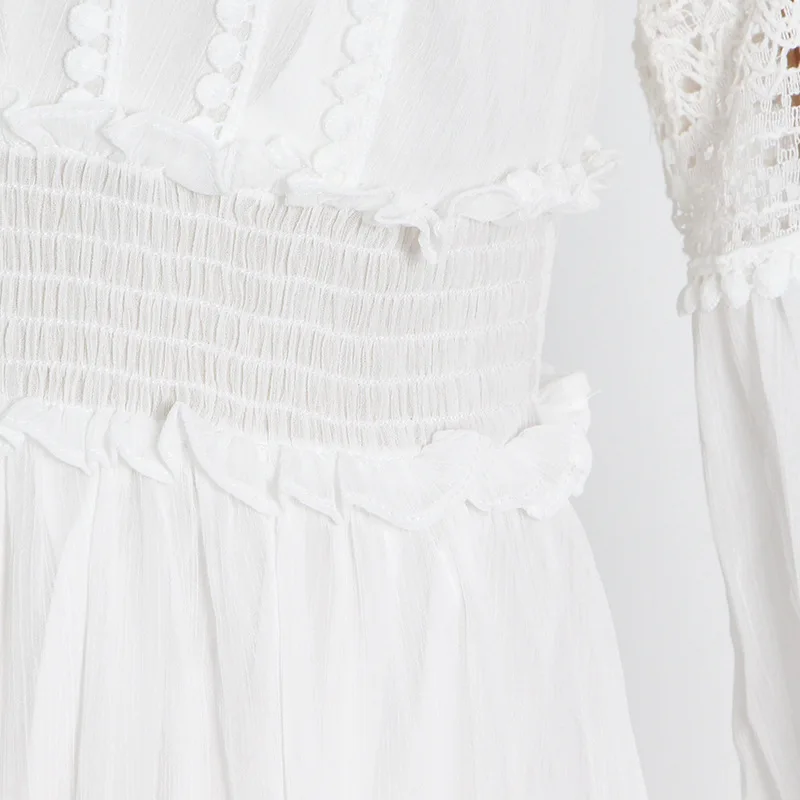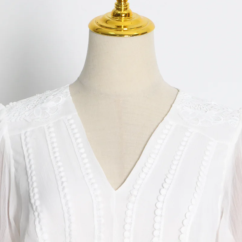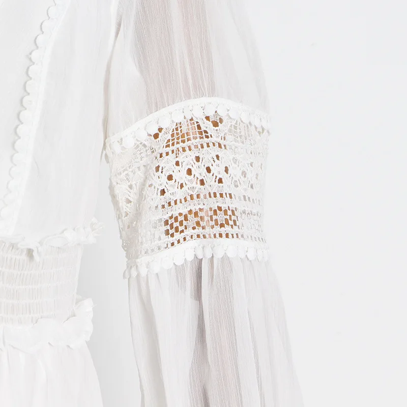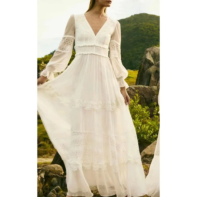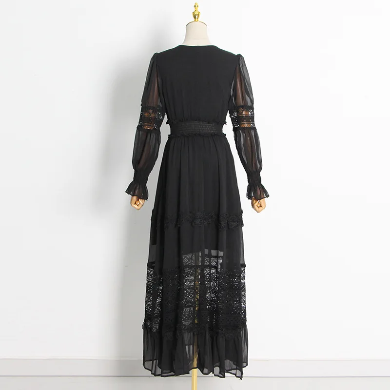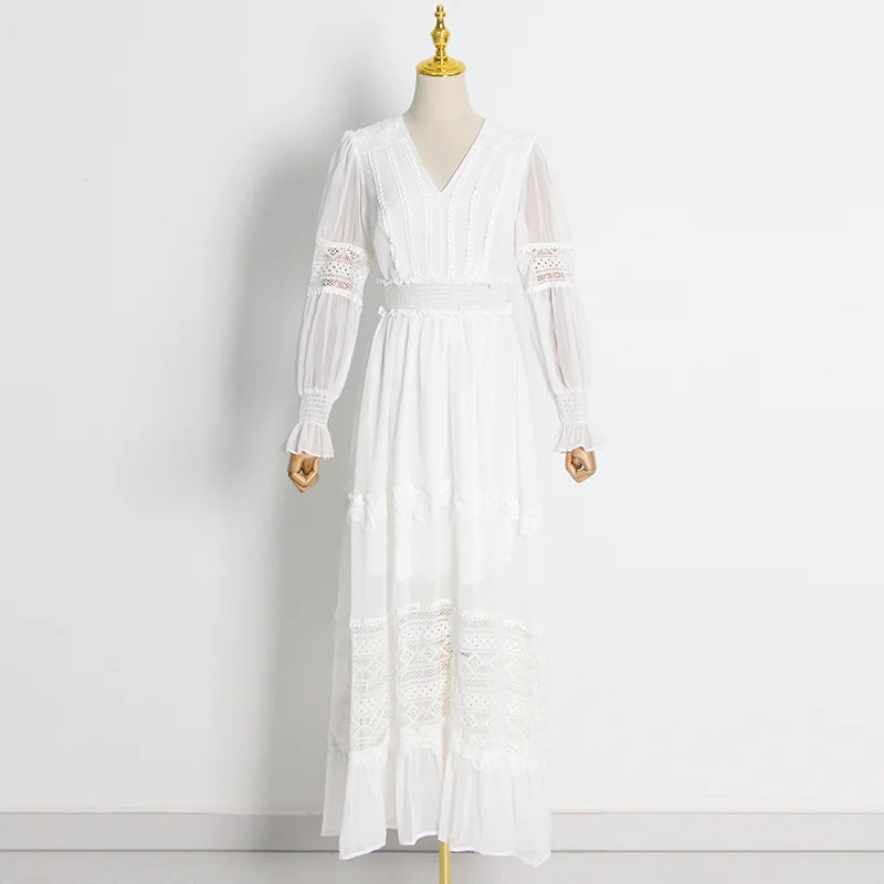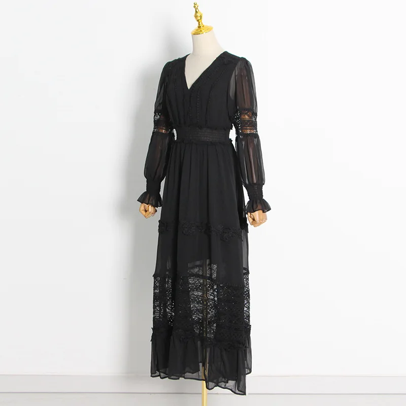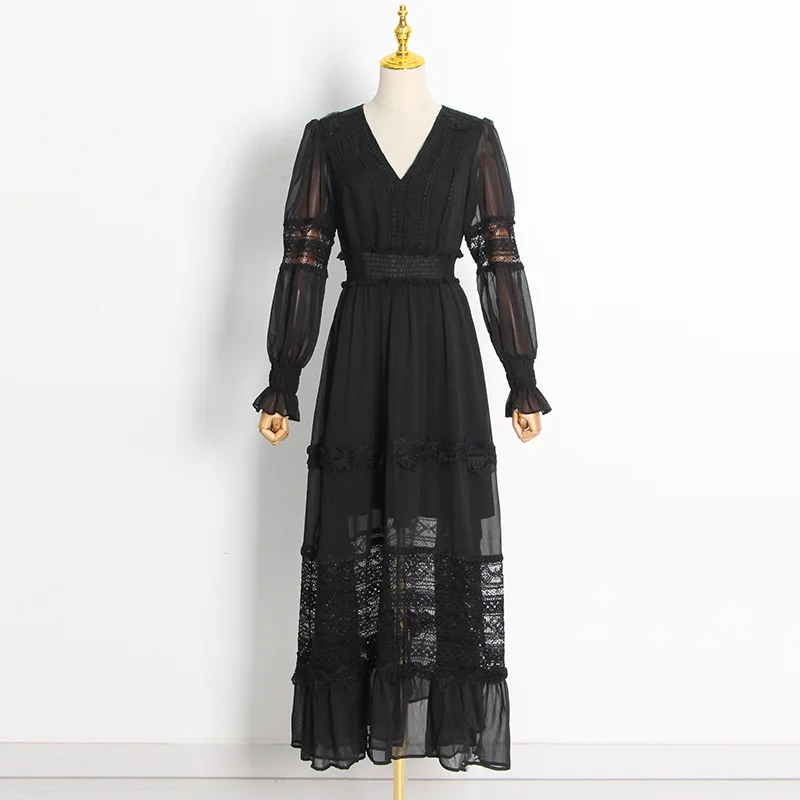 Vestidos Verano Solid Mesh Long Dresses 2022 Autumn New V-neck Long-sleeved Hollow Stitching Lace Swing Dress