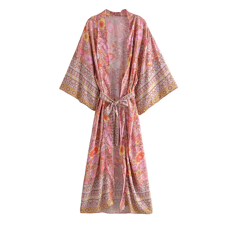 Vintage Chic Women Pink Floral Print Beach Bohemian Kimono Ladies V Neck Sleeves Maxi Robe Summer Boho Bikini Cover-ups