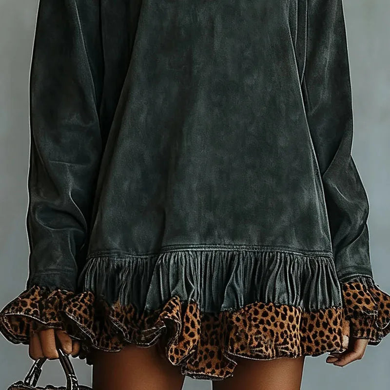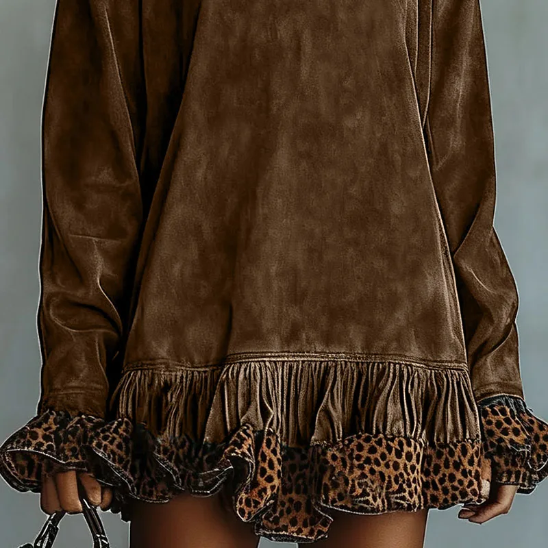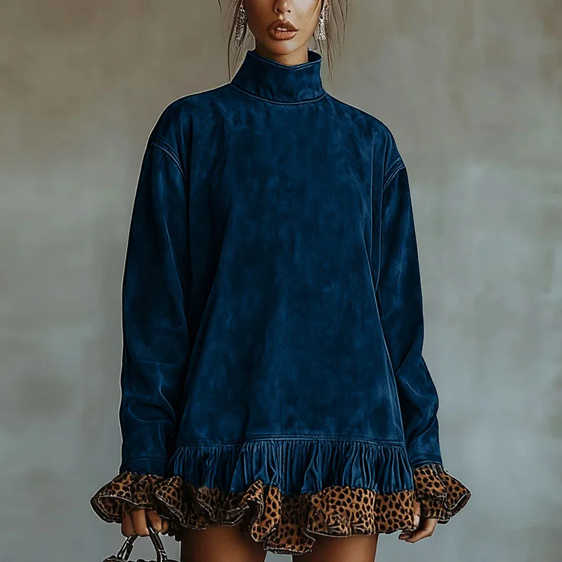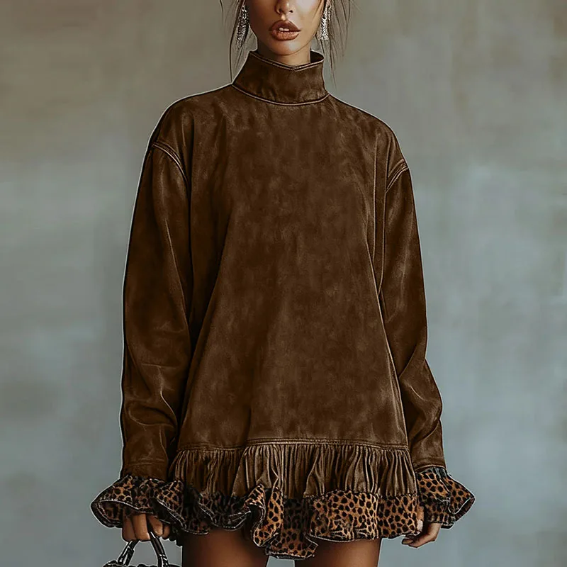 Vintage Fashion Patchwork Leopard Ruffle Dress Woman Casual Turtleneck Slim Mini Dress Autumn Long Sleeve Female Pullovers Dress