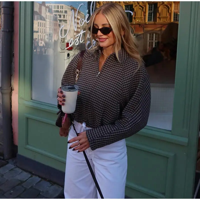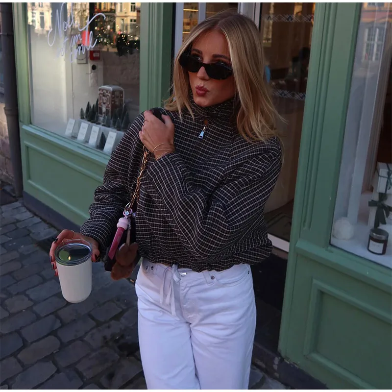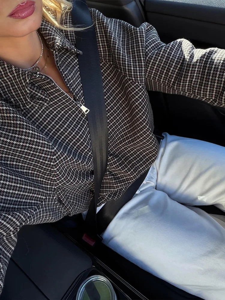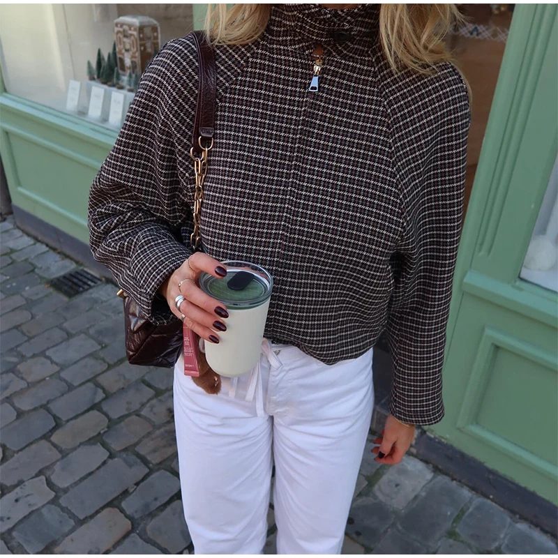 Vintage Plaid Women 's Jacket Elegant Lapel Patchwork Full Sleeve Zipper Cropped Jackets Lady 2026 Woman Spring Coats Outwears