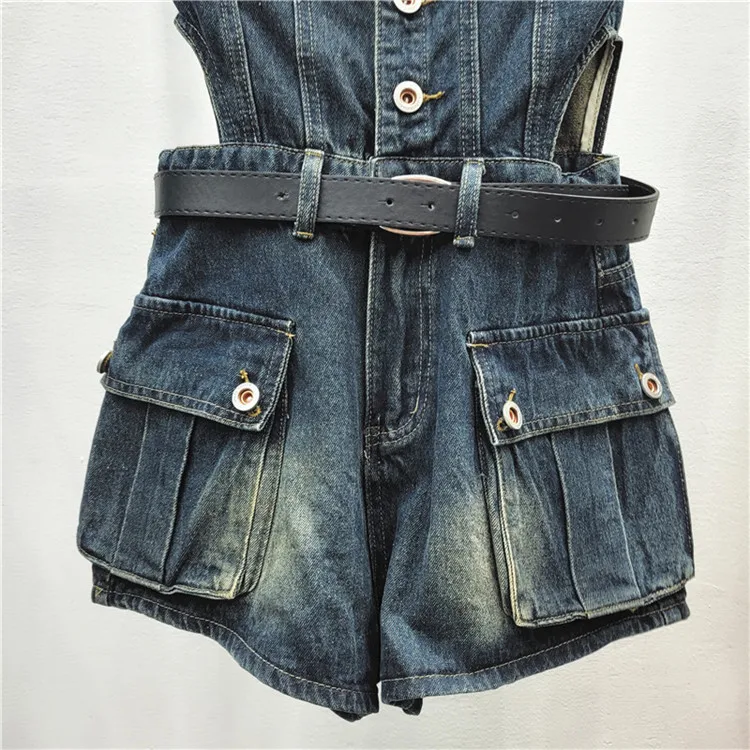 Vintage Pockets Casual Denim Jumpsuits For Women Strapless Sleeveless High Waist Off Shoulder Jumpsuit
