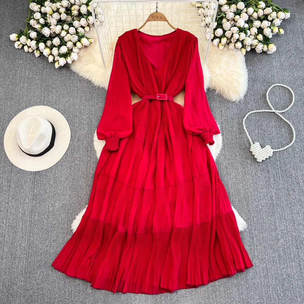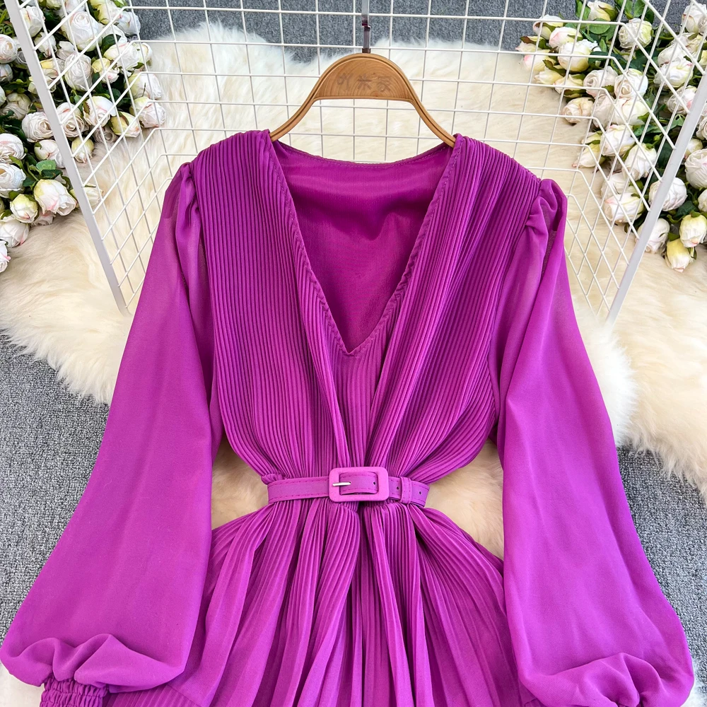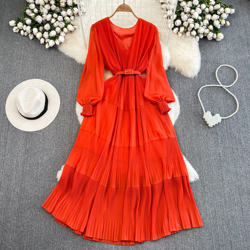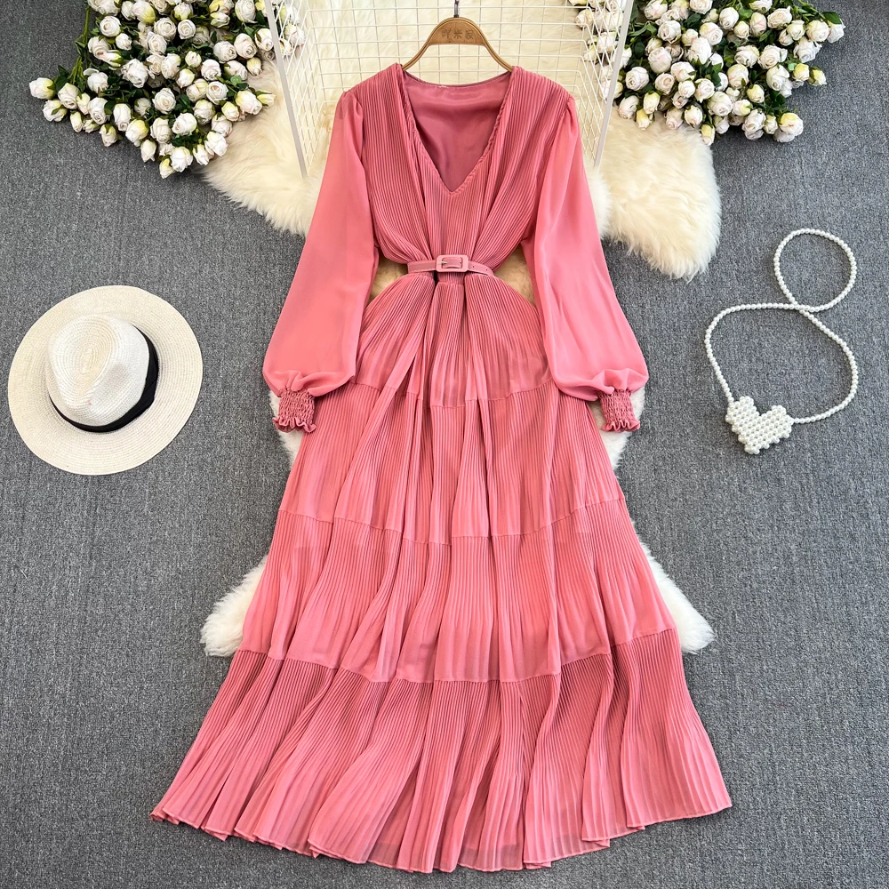 Vintage Slim V Neck Chiffon Pleated Long Dress Party Dress Formal Womens Elegant Office Tunic Dress For Women