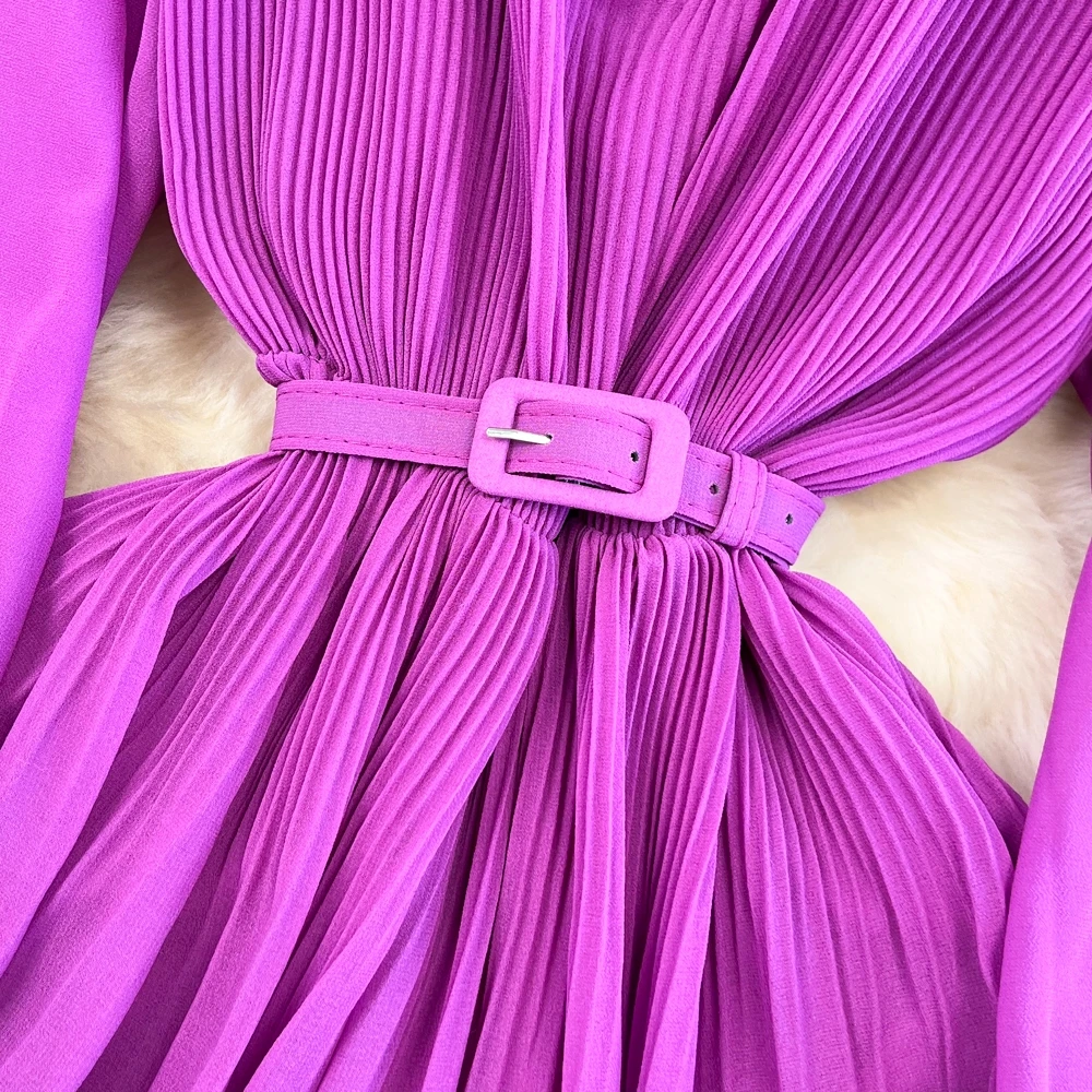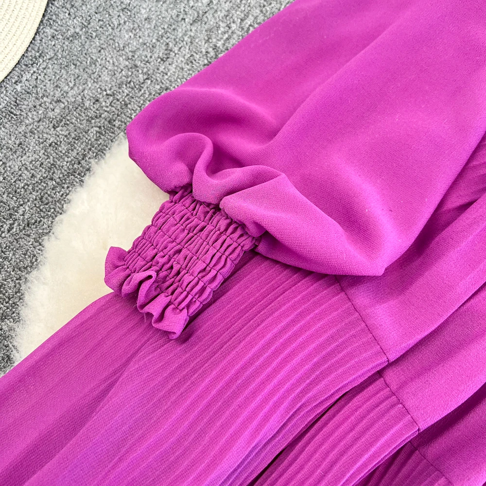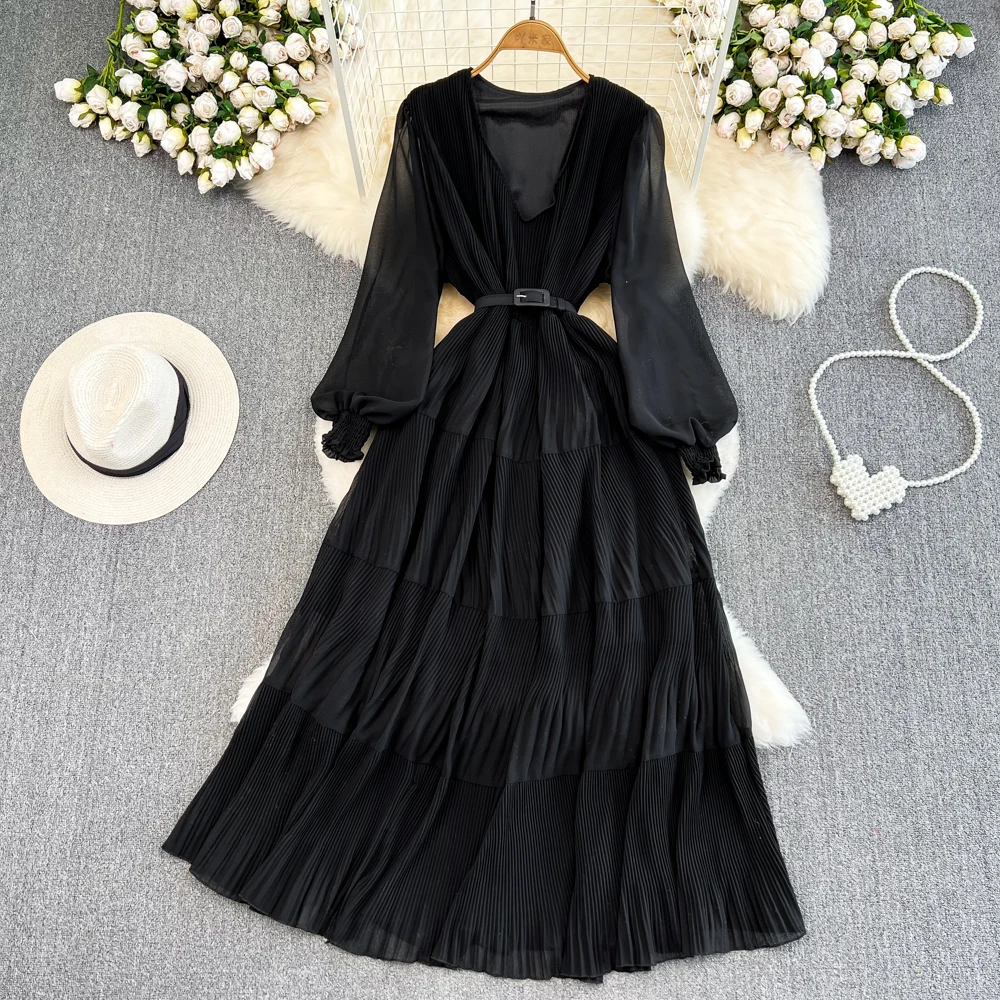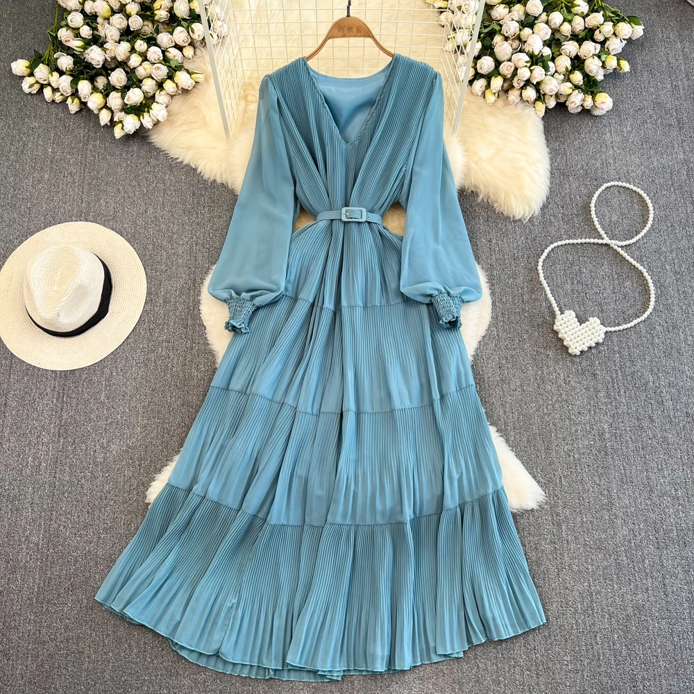 Vintage Slim V Neck Chiffon Pleated Long Dress Party Dress Formal Womens Elegant Office Tunic Dress For Women