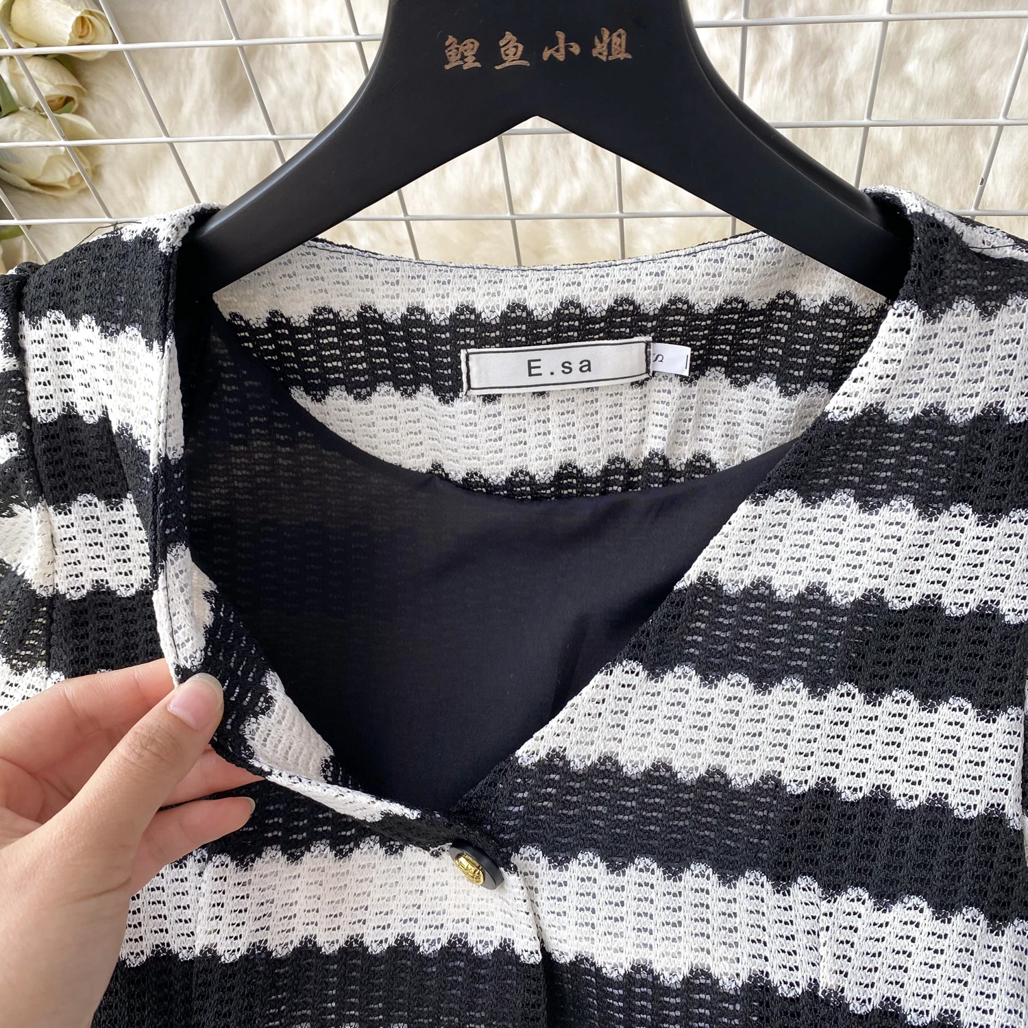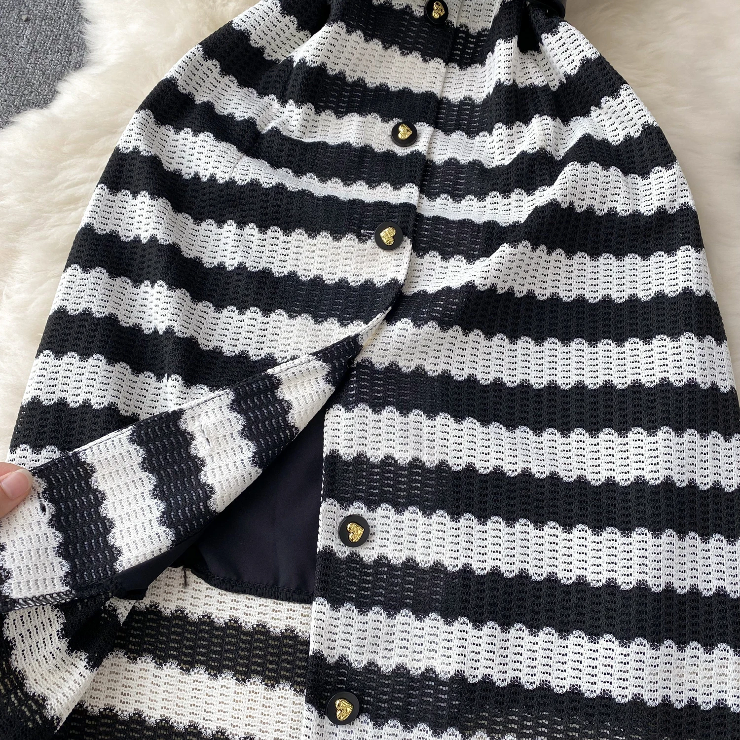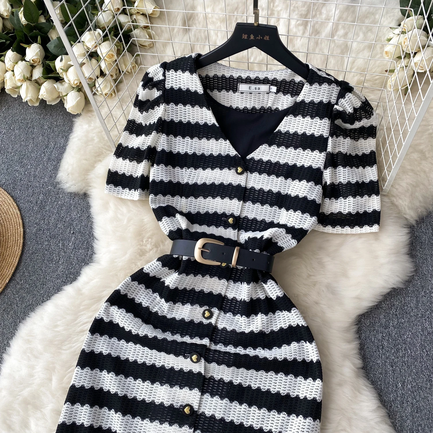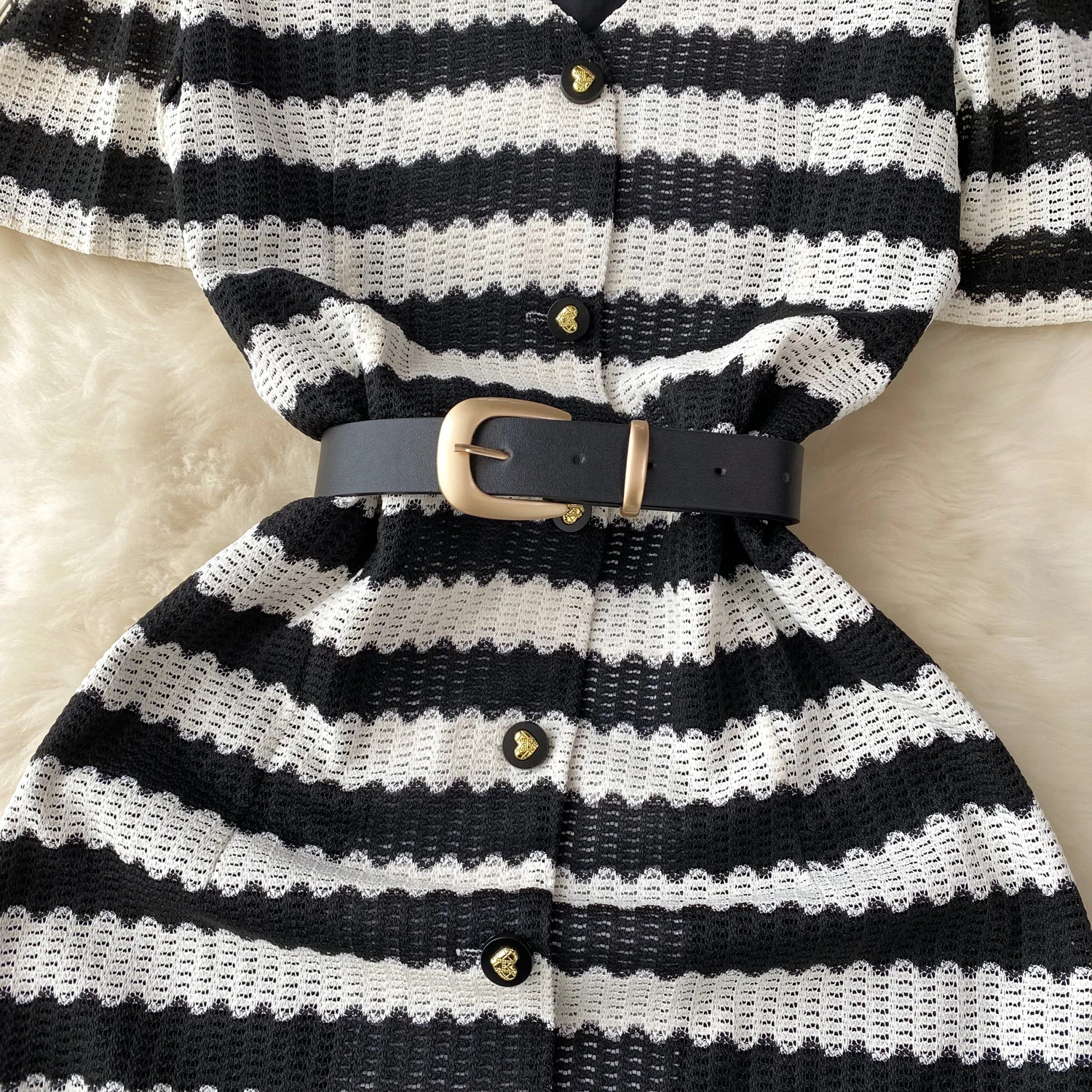 Vintage Style Striped Dress Women's Summer Hollow Single Breasted Design Sense Of High Class Dress