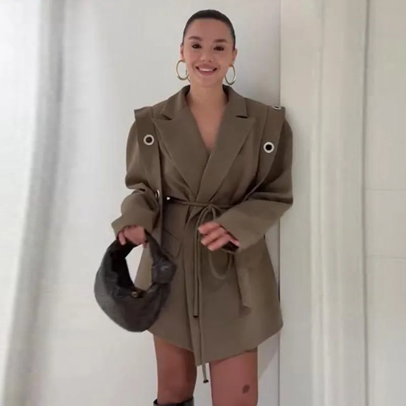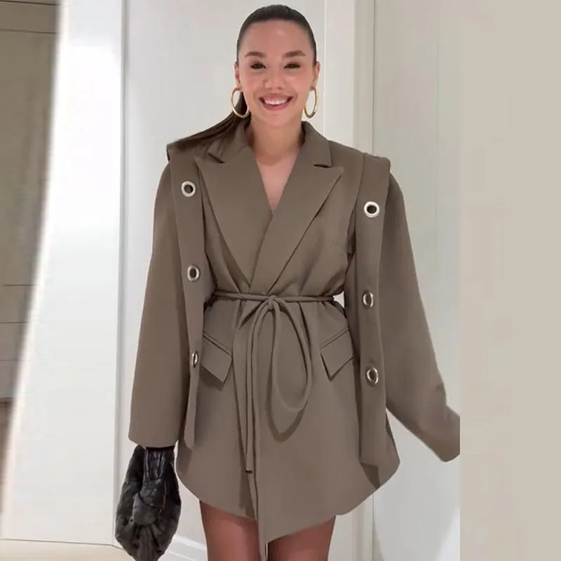 Vintage Tie Up Women 's Coats Elegant Laple Full Sleeve Pockets Hollow Out Blazer Female 2025 Autumn Winter Fashion Streetwears