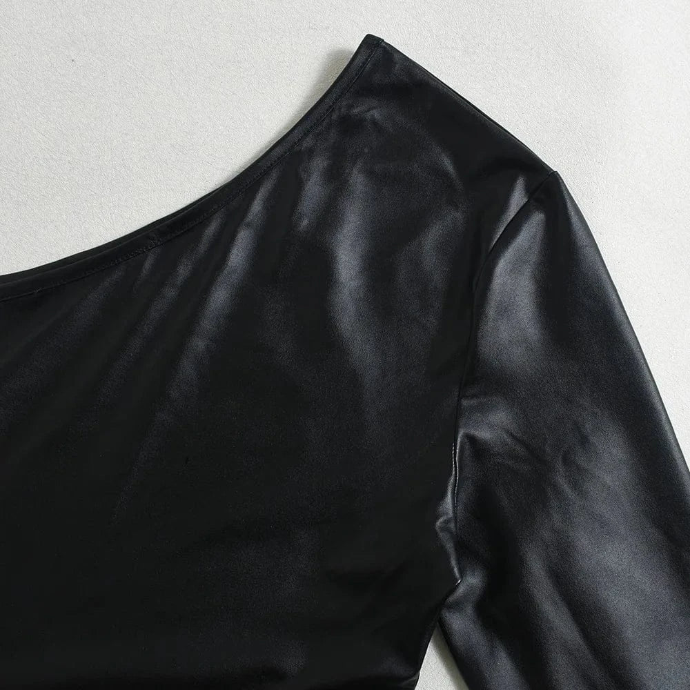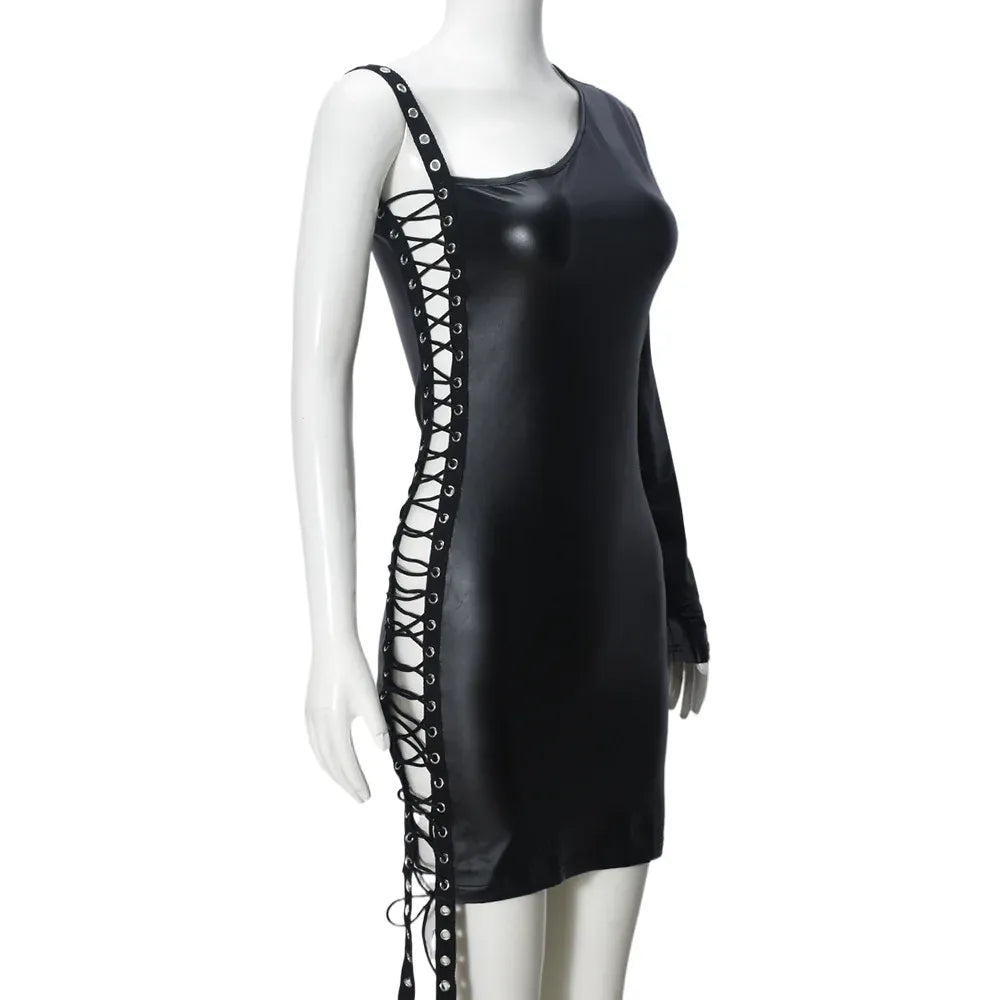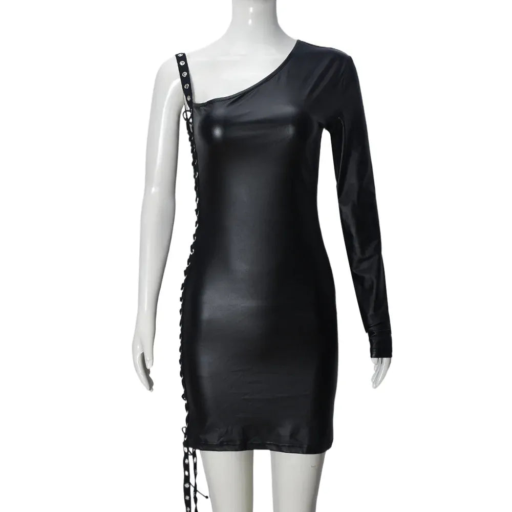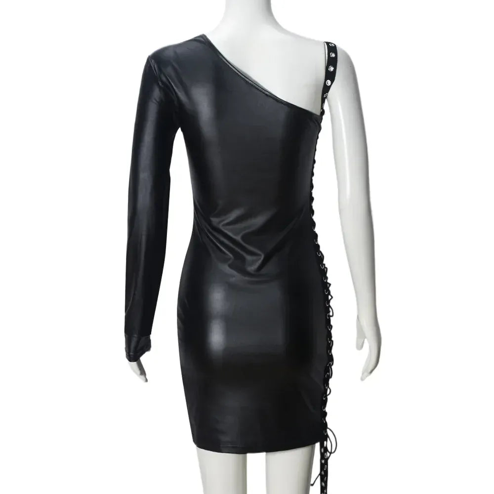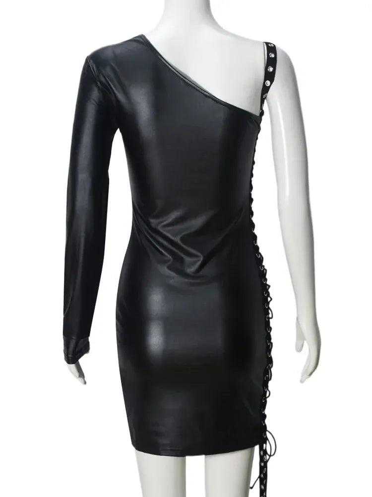 Weird Puss Bandage Hollow Dress Women Irregular Diagonal Collar Backless Single Sleeve Hot Girls Skinny Peach Hip Mini Bodycon