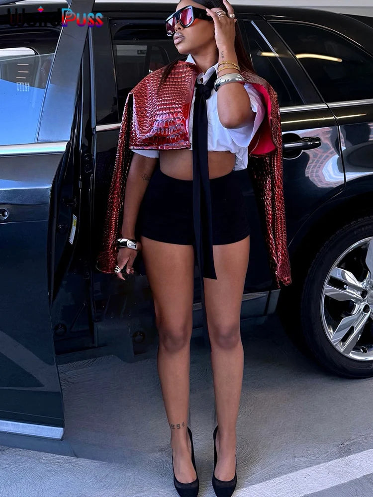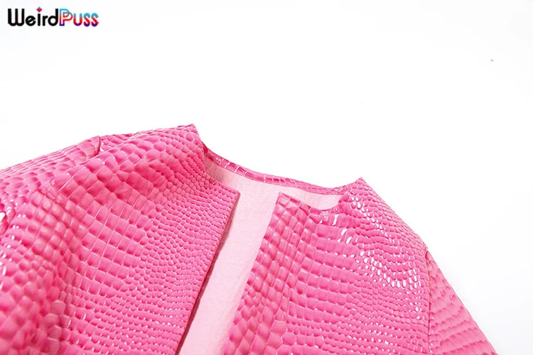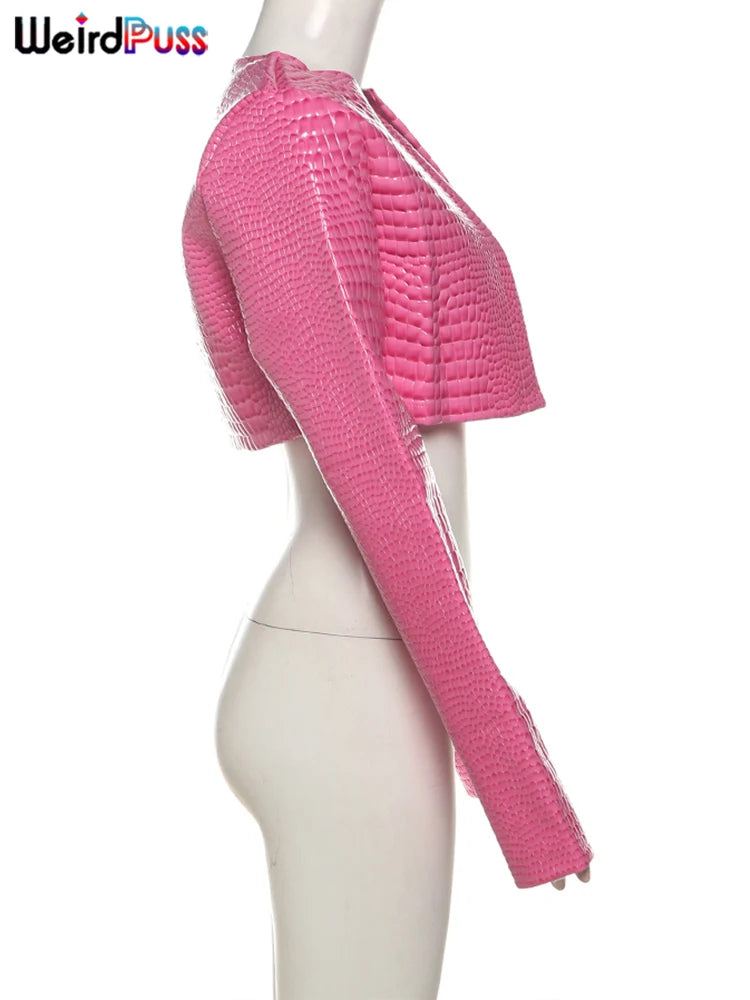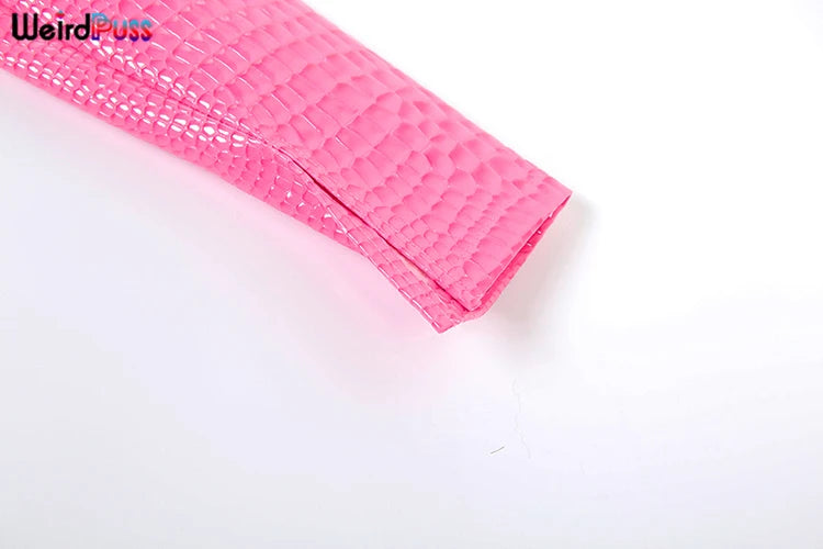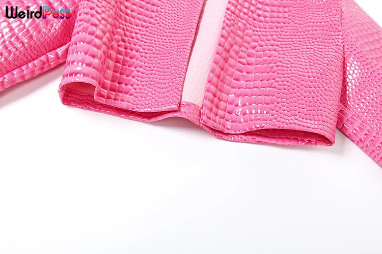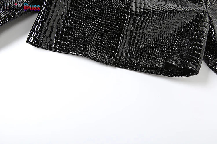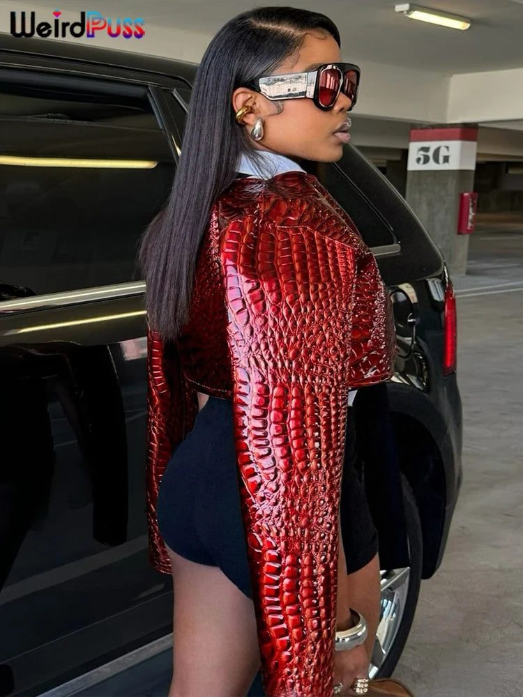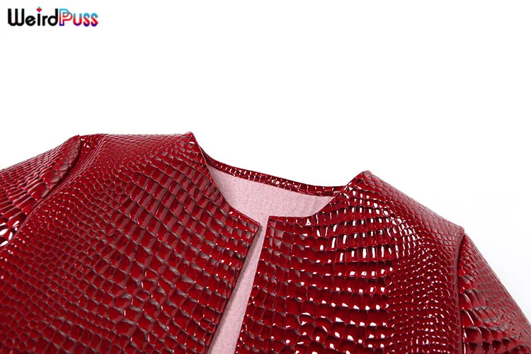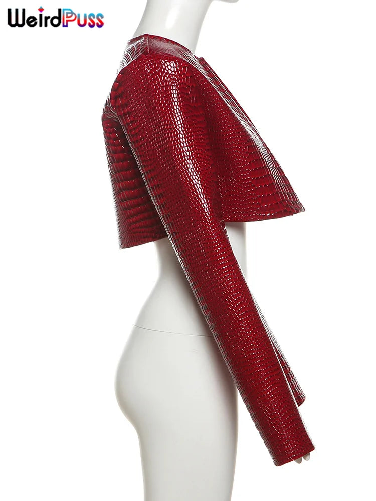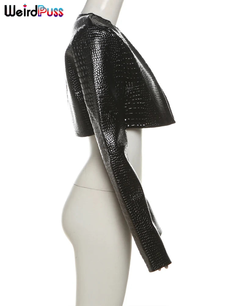 Weird Puss Faux Leather Jacket Women Hipster Snake Print Fall Trend O-Neck Full Sleeve Street Wild Basic Outwear Crop Overcoat