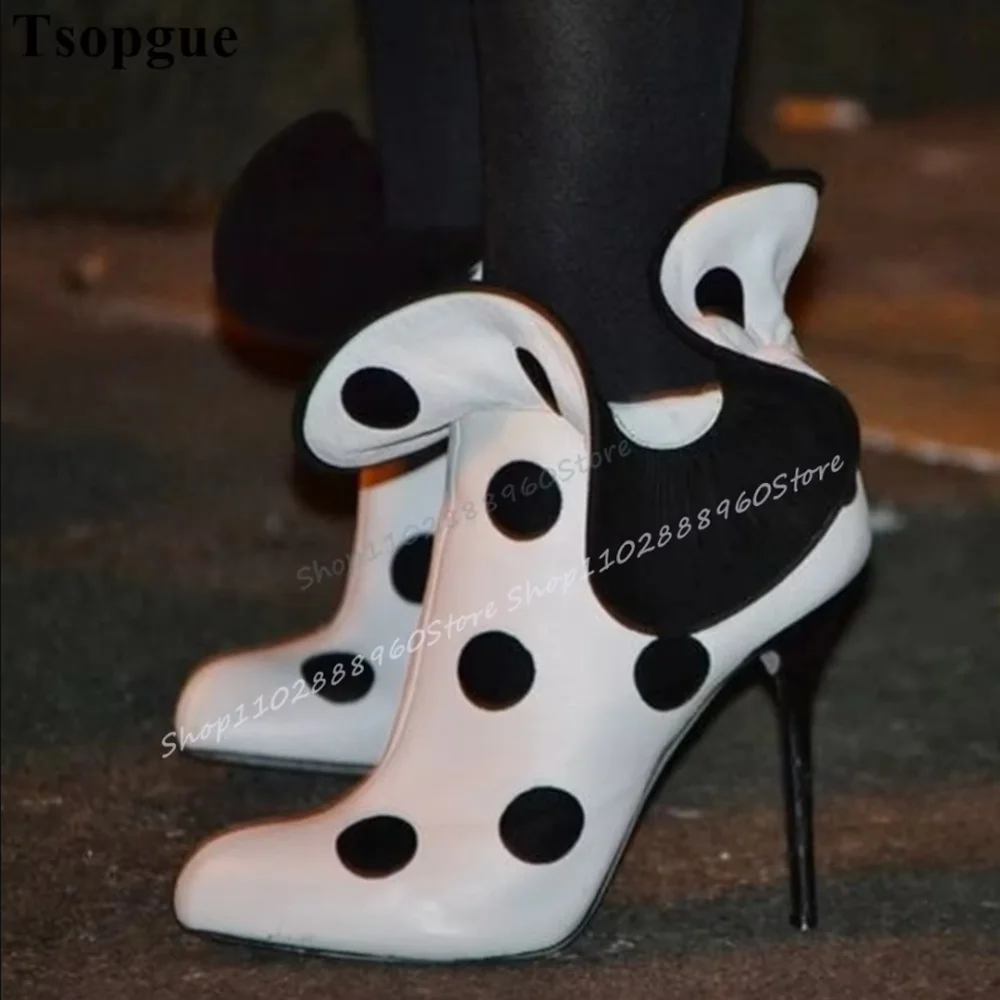 White And Black Dot Ruffles Ankle Boots Thin High Heel Shoes For Women Side Zipper Pointed Toe Casual Occidental Style Boots