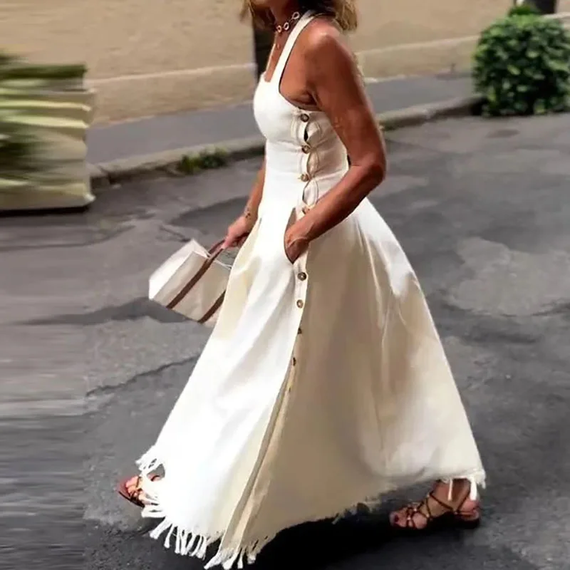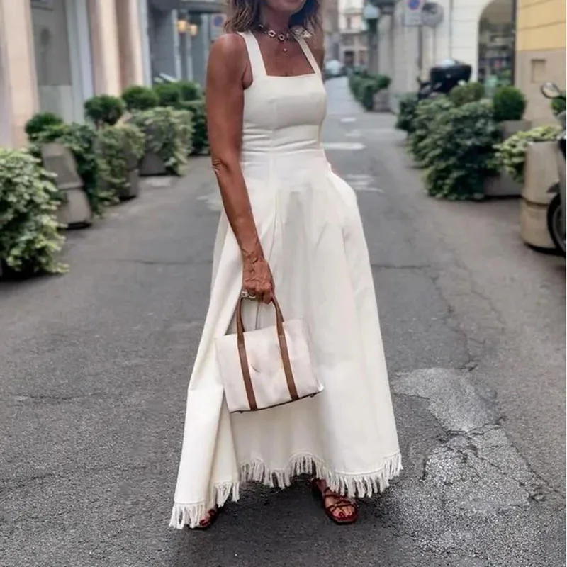 White Camisole Summer Long Dress Casual Off Shoulder Pocket Slim Fit Dress Elegant Tassel Patchwork High Waisted Party Dresses