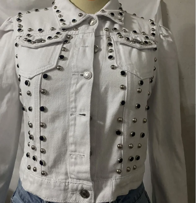White coat bubble puffy sleeve crop jacket ladies bead rivet fall denim jackets women