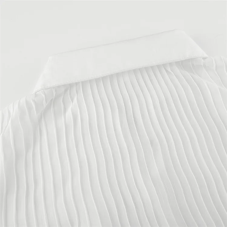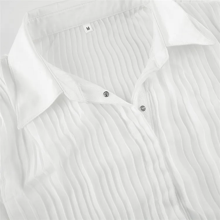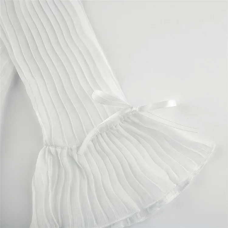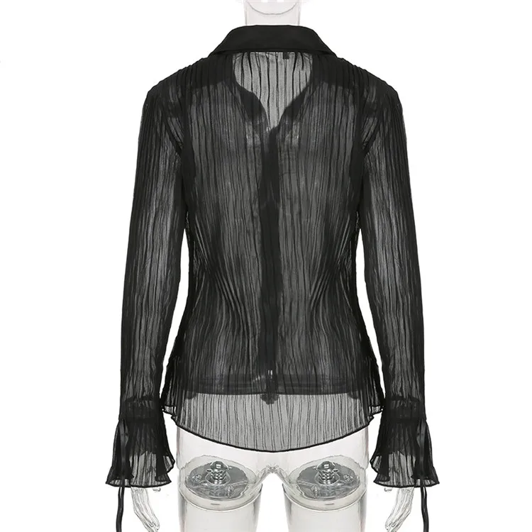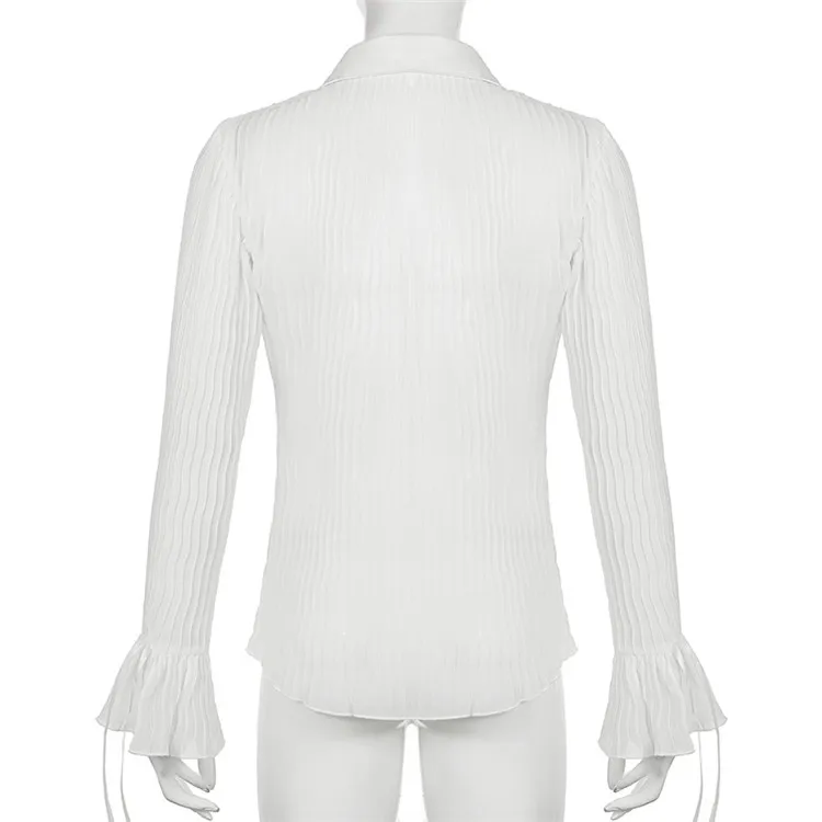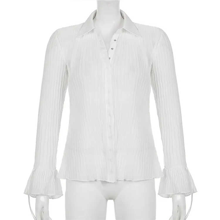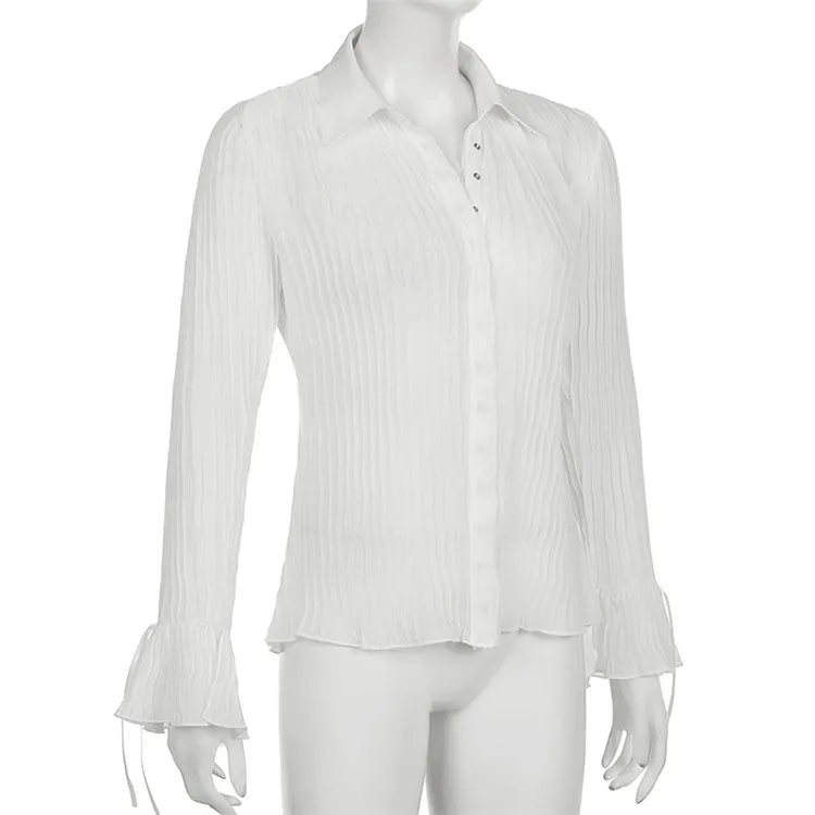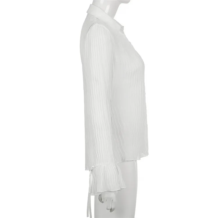 White Folds Cute Y2K Shirts Women Elegant Fashion Flared Sleeve Button Tops See Through Sexy Mesh Girl Tops