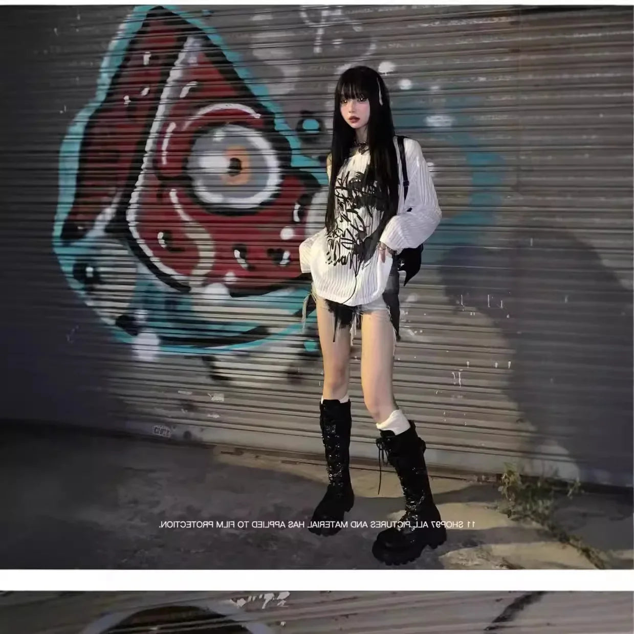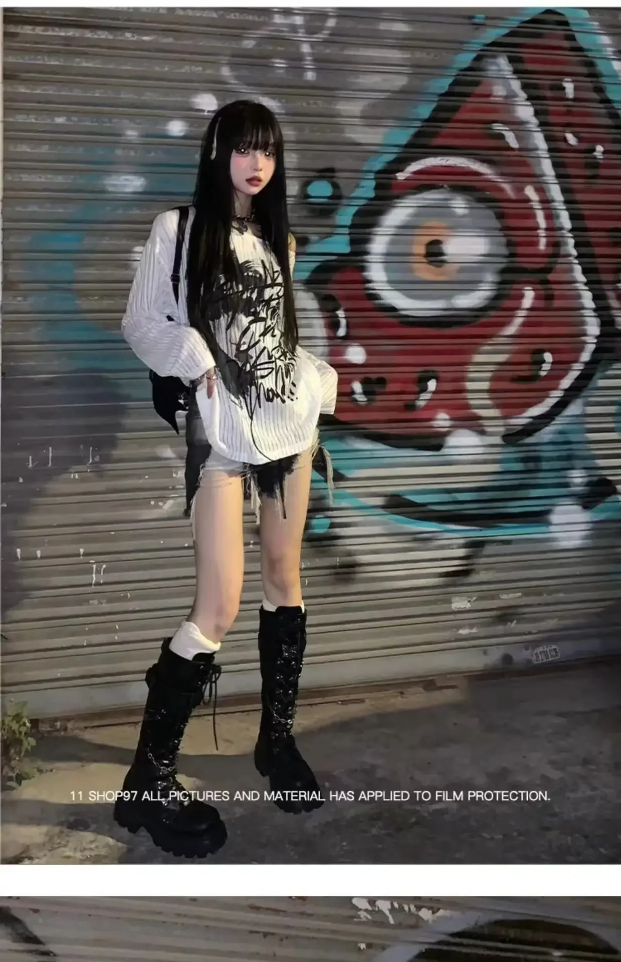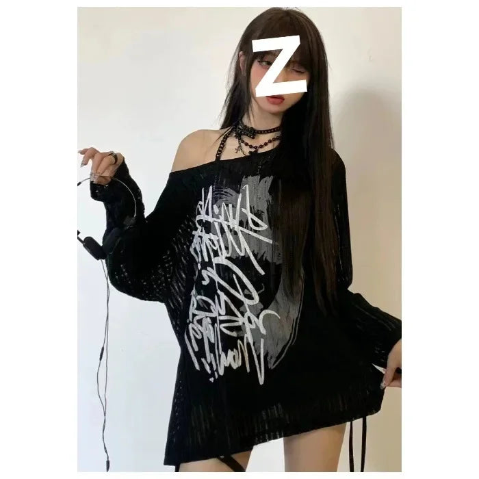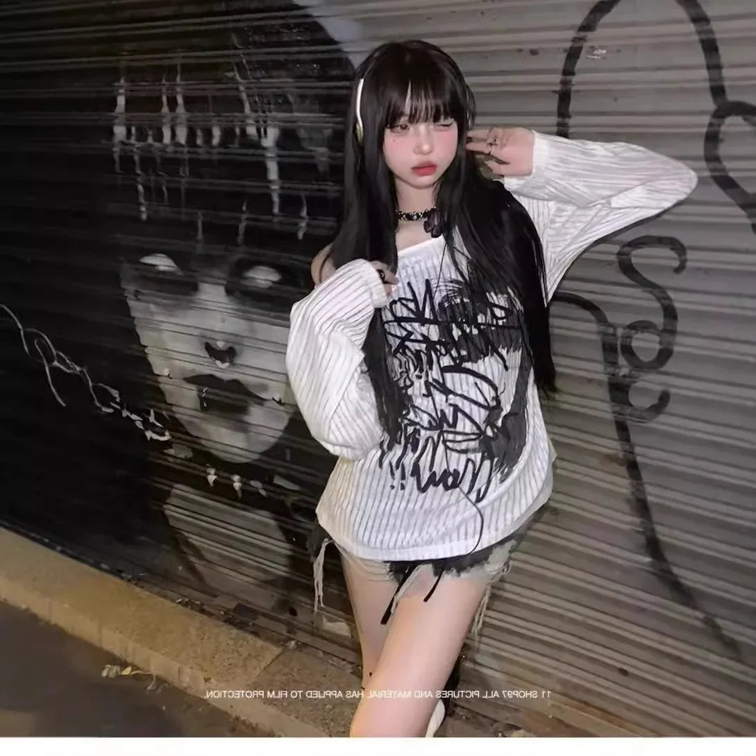 White Inner Long Sleeve T-Shirt Women's Graffiti Printing Sun Protection Cover Up Loose-Fit Knitted Top Pure Desire Top