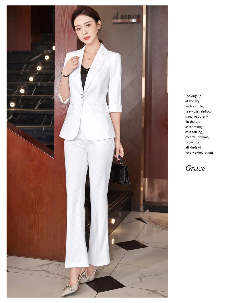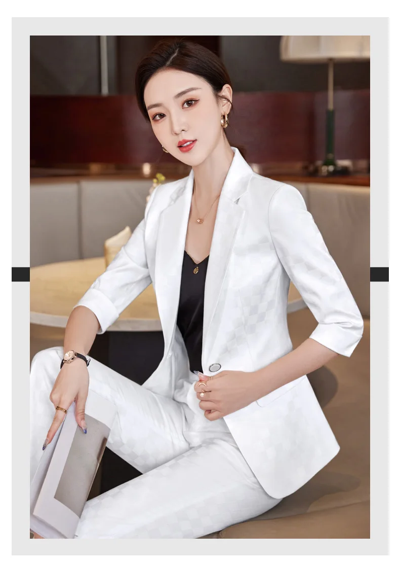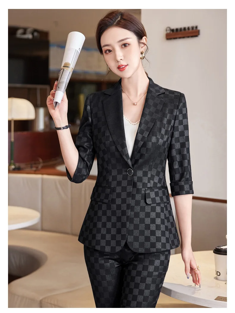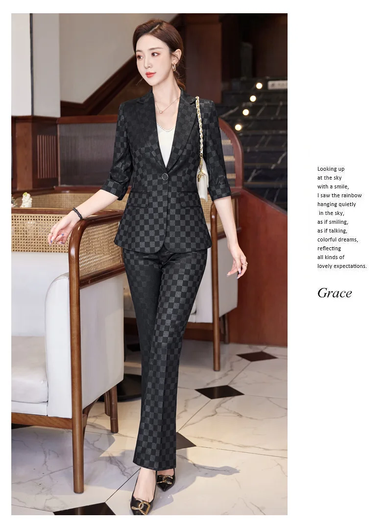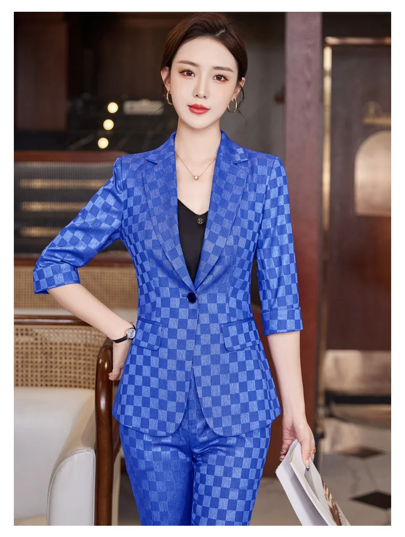 Wholesale 2 Piece Suit Set for Women High-quality Office Lady Blue Plaid Pant Suits Fashion Half-sleeve Jacket Blazer Trouser