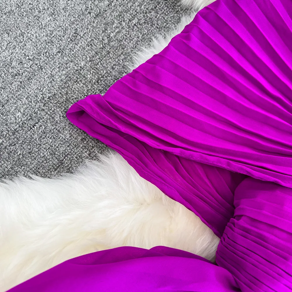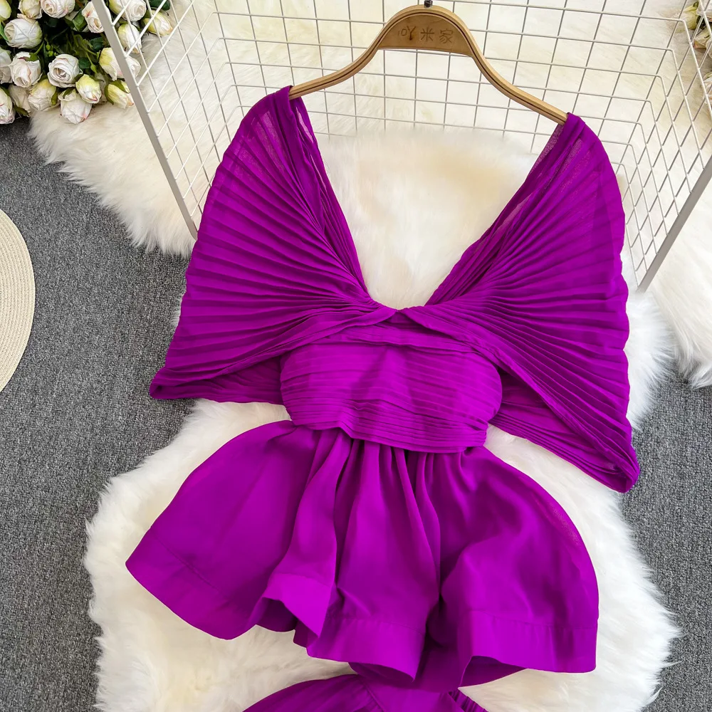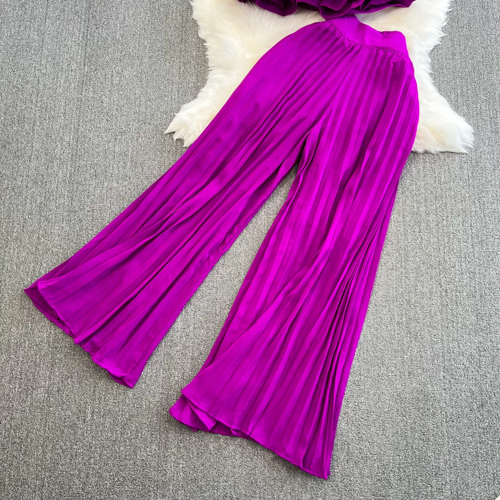 Wholesale 2024 Summer Pleated Bat Sleeves V-neck Waist Wrapped Lotus Leaf Swing Top High Waist Wide Leg Pants Women's Set