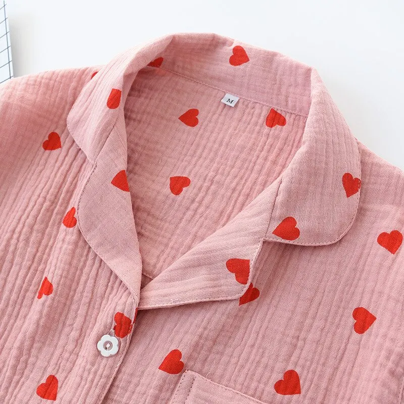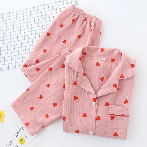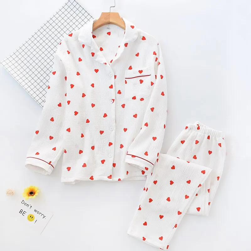 Wholesale Adult Sleepwear 2PCS Heart Print Pajamas Suit Womens Warm Winter Nightwear Turn Down Collar Shirt Pant Loose Casual