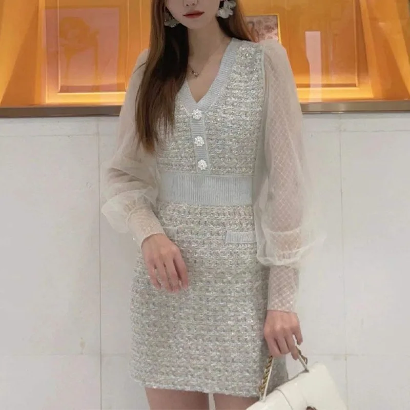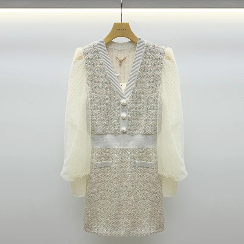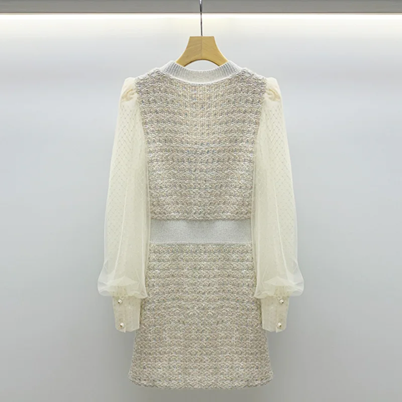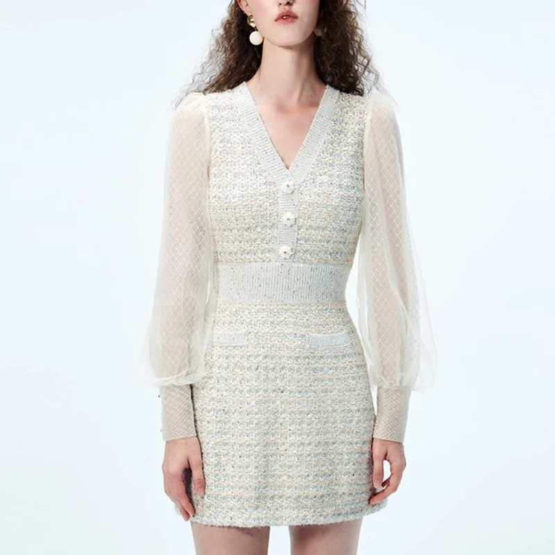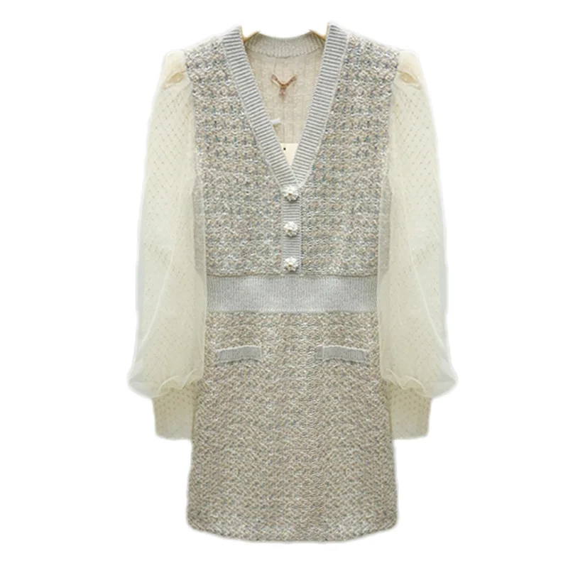 Wholesale and custom High quality luxury patchwork ruffled lace pearl beaded career dresses lady elegant tweed dress