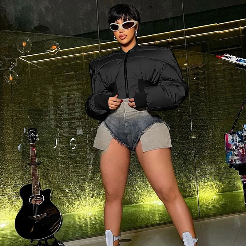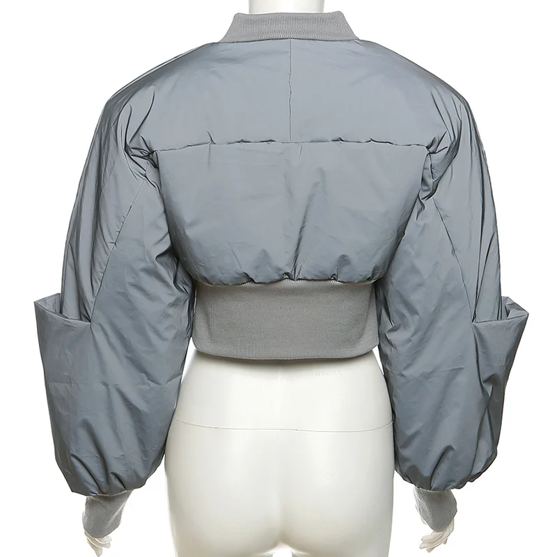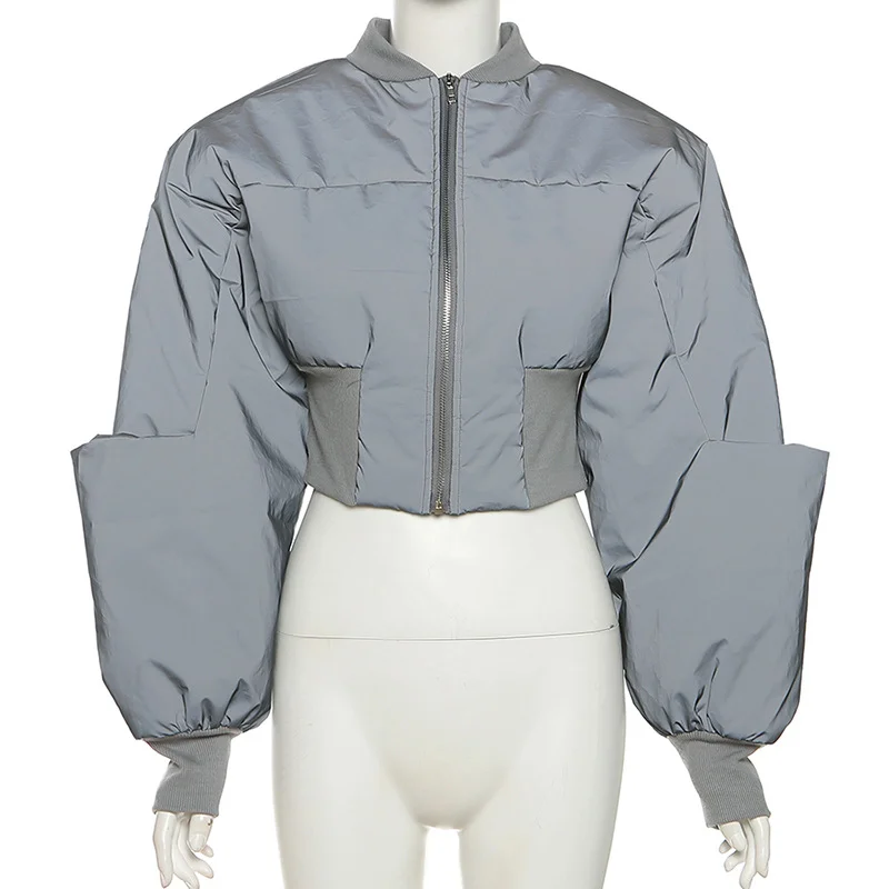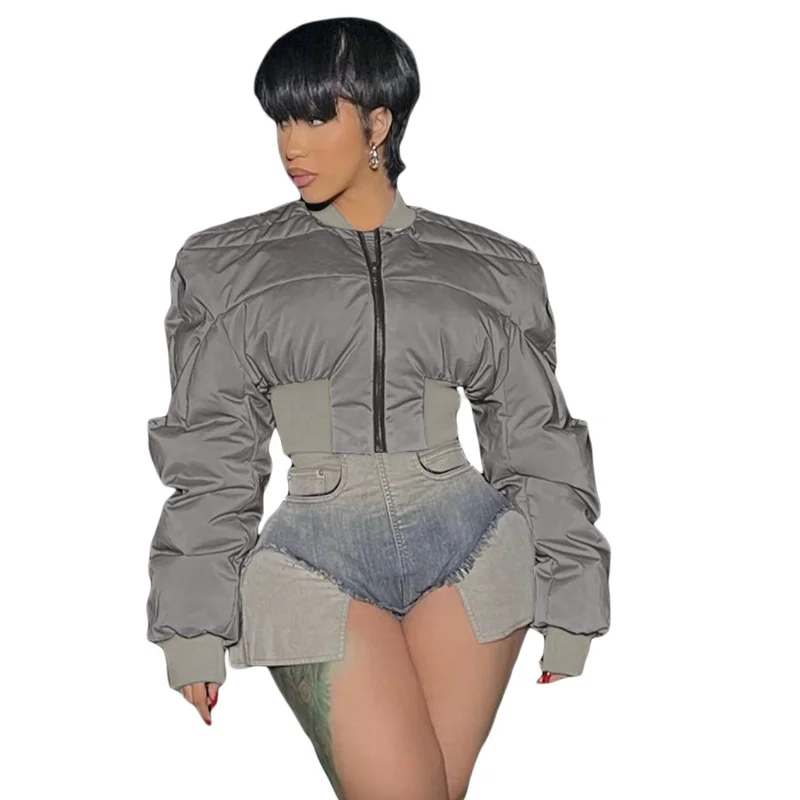 Wholesale Autumn Coat Fashion Zipper Glossy Cotton Jacket Woman Clothes 2023 Crew Neck Solid Long Sleeve Gird Skinny Jacket