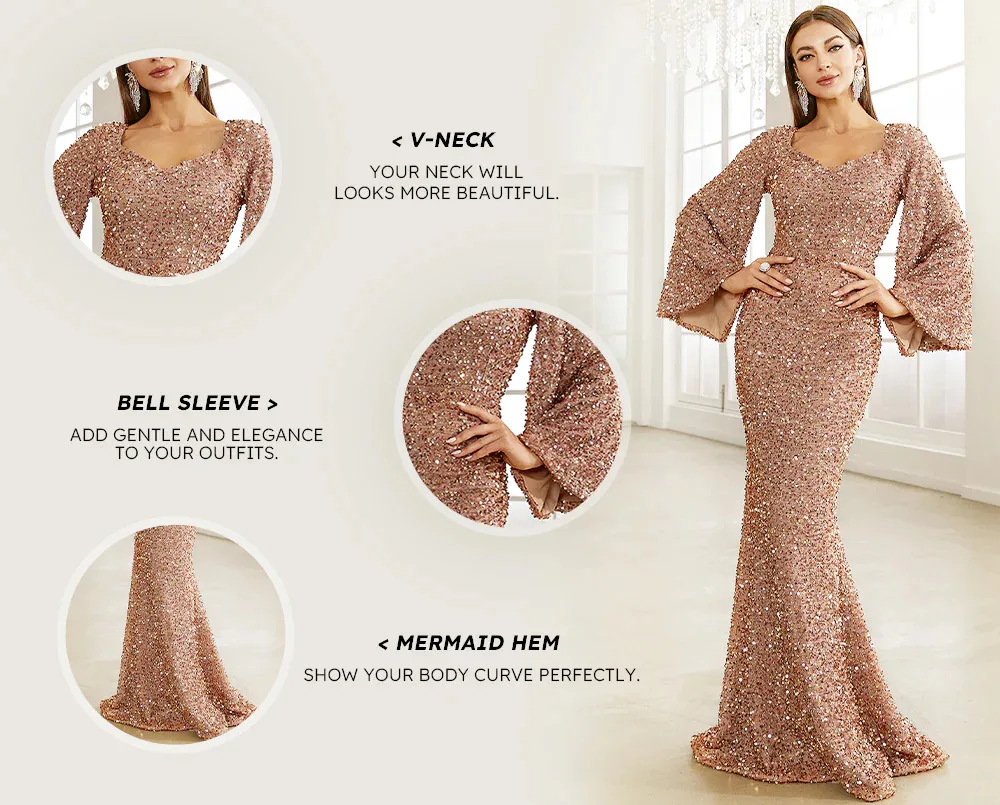 Long dress elegant women floor-length v-neck a line dress with sleeves women floor-length sequin dresses