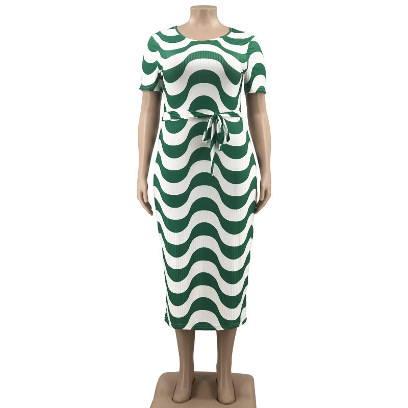 Wholesale Custom Casual Summer Women Plus Size Dress Plus Size Striped Crew Neck Short Sleeve Midi Dress
