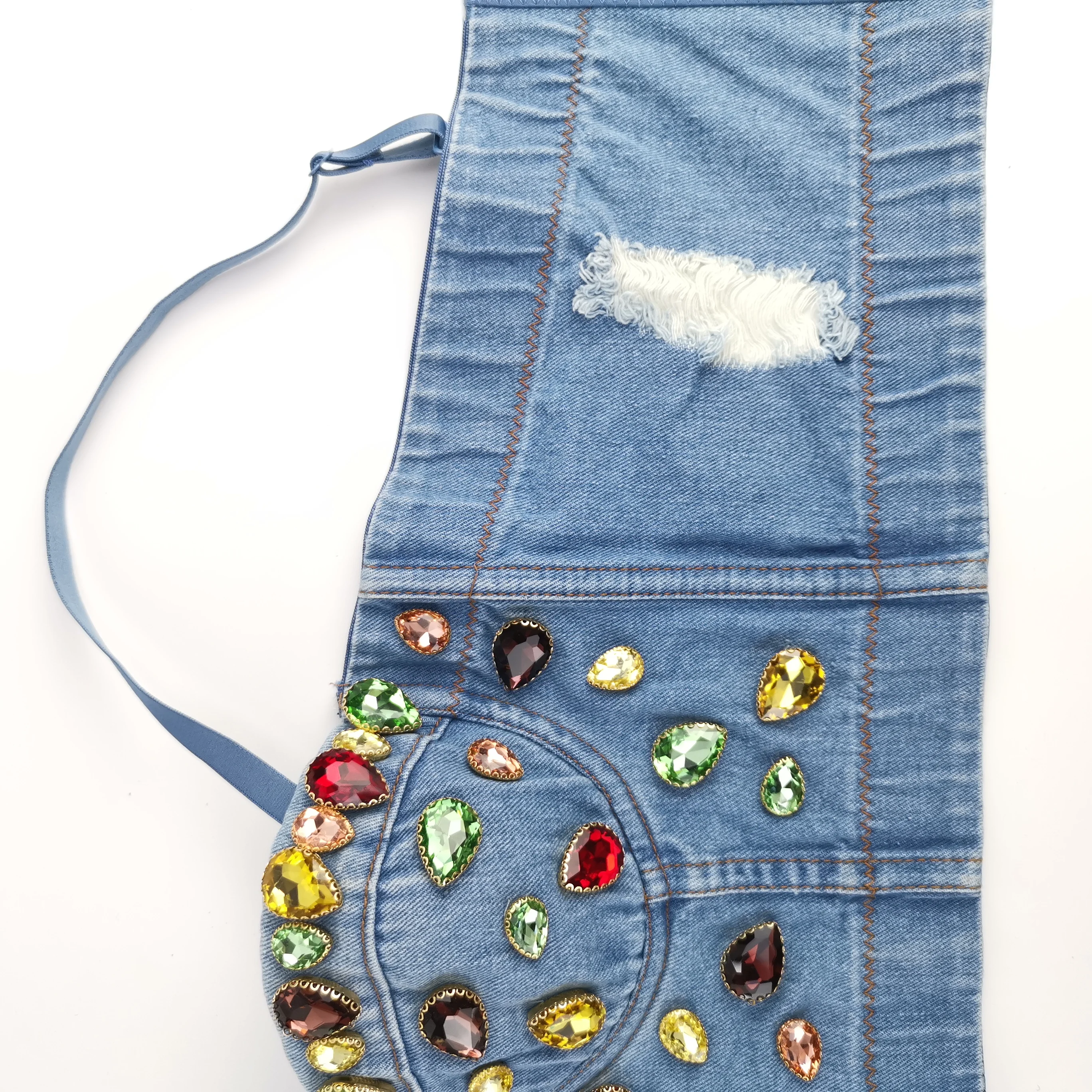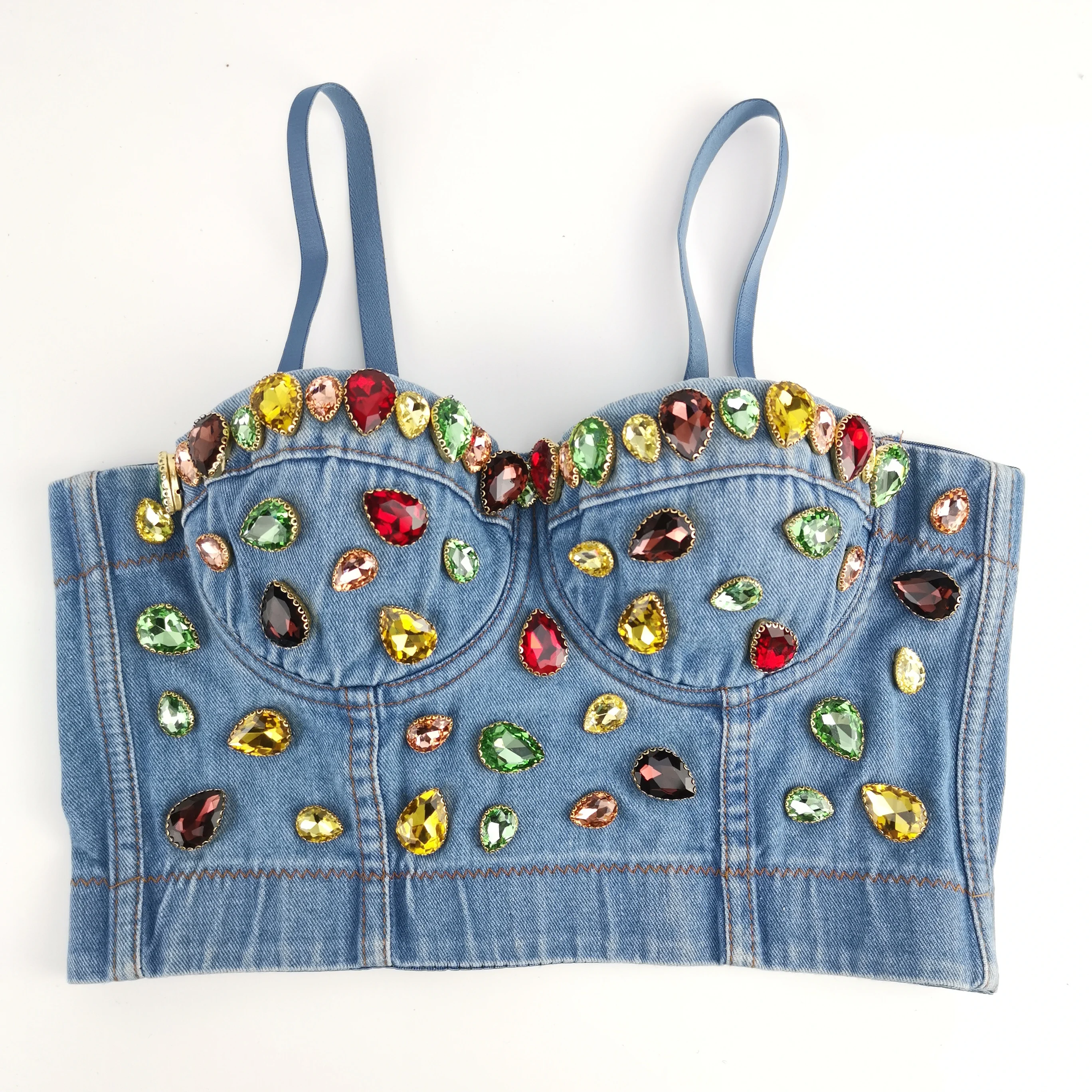 Wholesale Custom Glass Beaded Stone Denim Halter Sexy Crop Top For Women