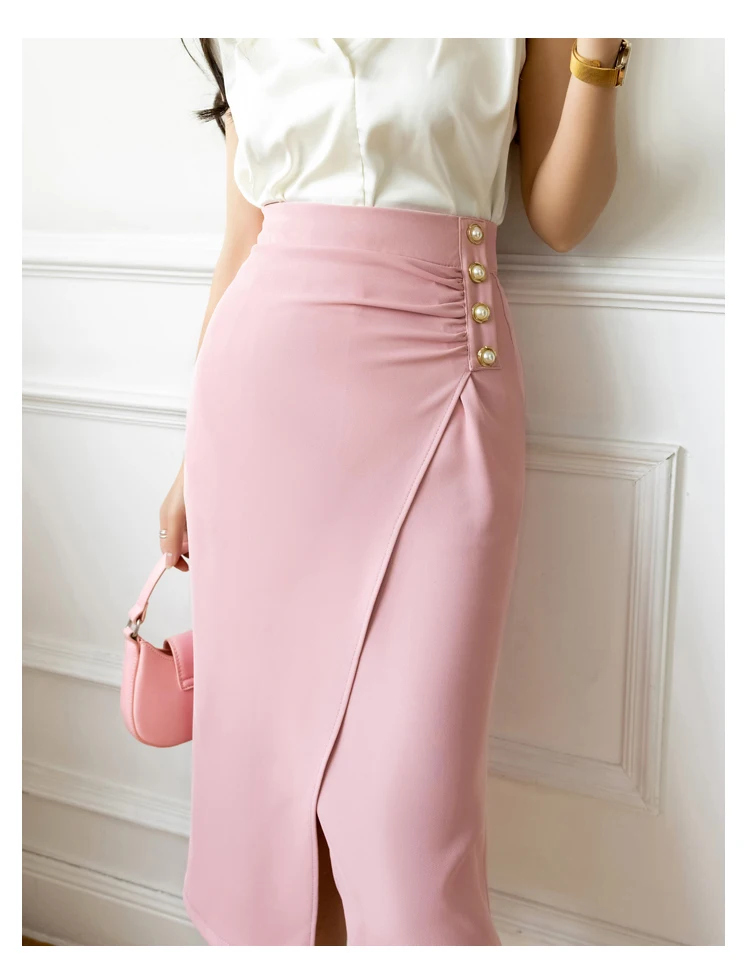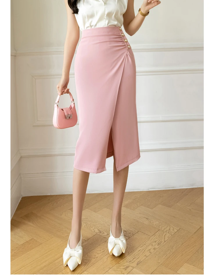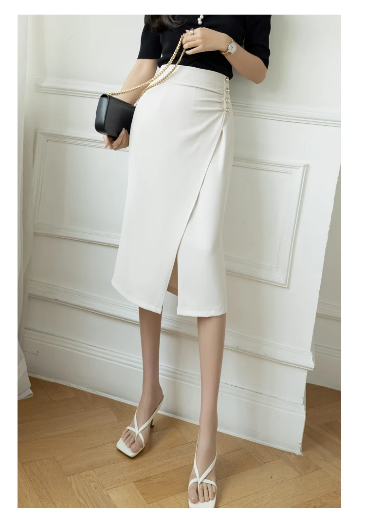 Wholesale Custom High Waist A-line Skirt Women Buttons Ruched Casual Slim Fit Fashion Office Ladies Midi Skirts Street Black