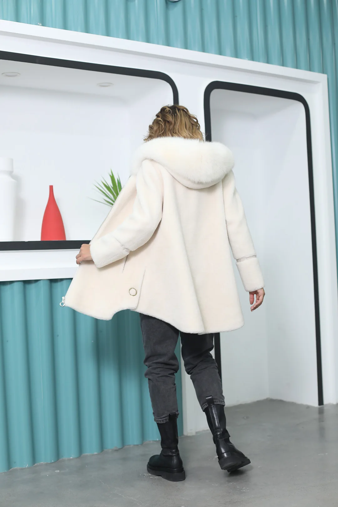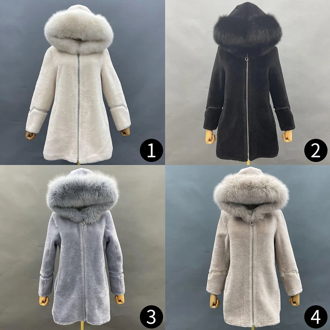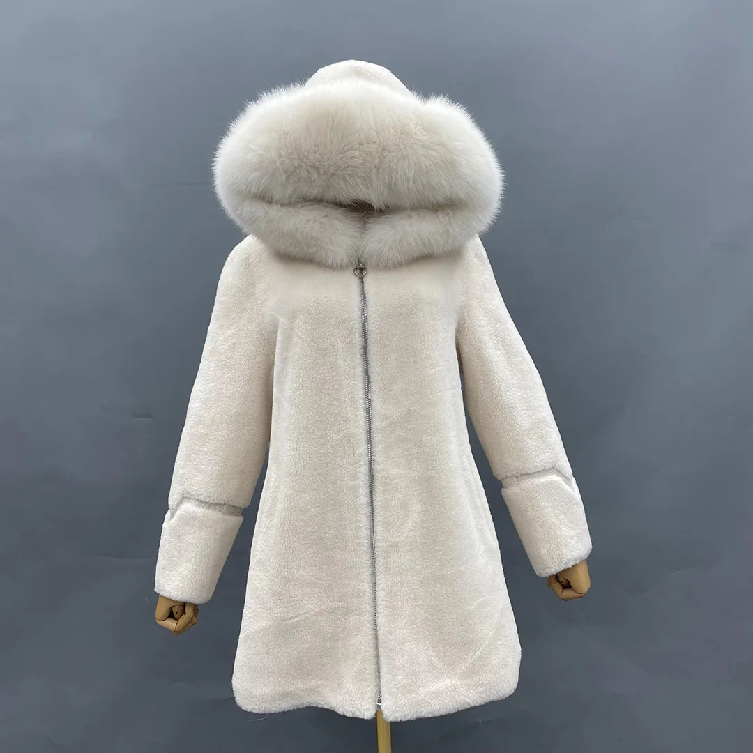 Wholesale Custom Oversize Women Fox Fur Collar Sheep Shearling Jacket Plus Size Long Hooded Real Sheep Wool Coat