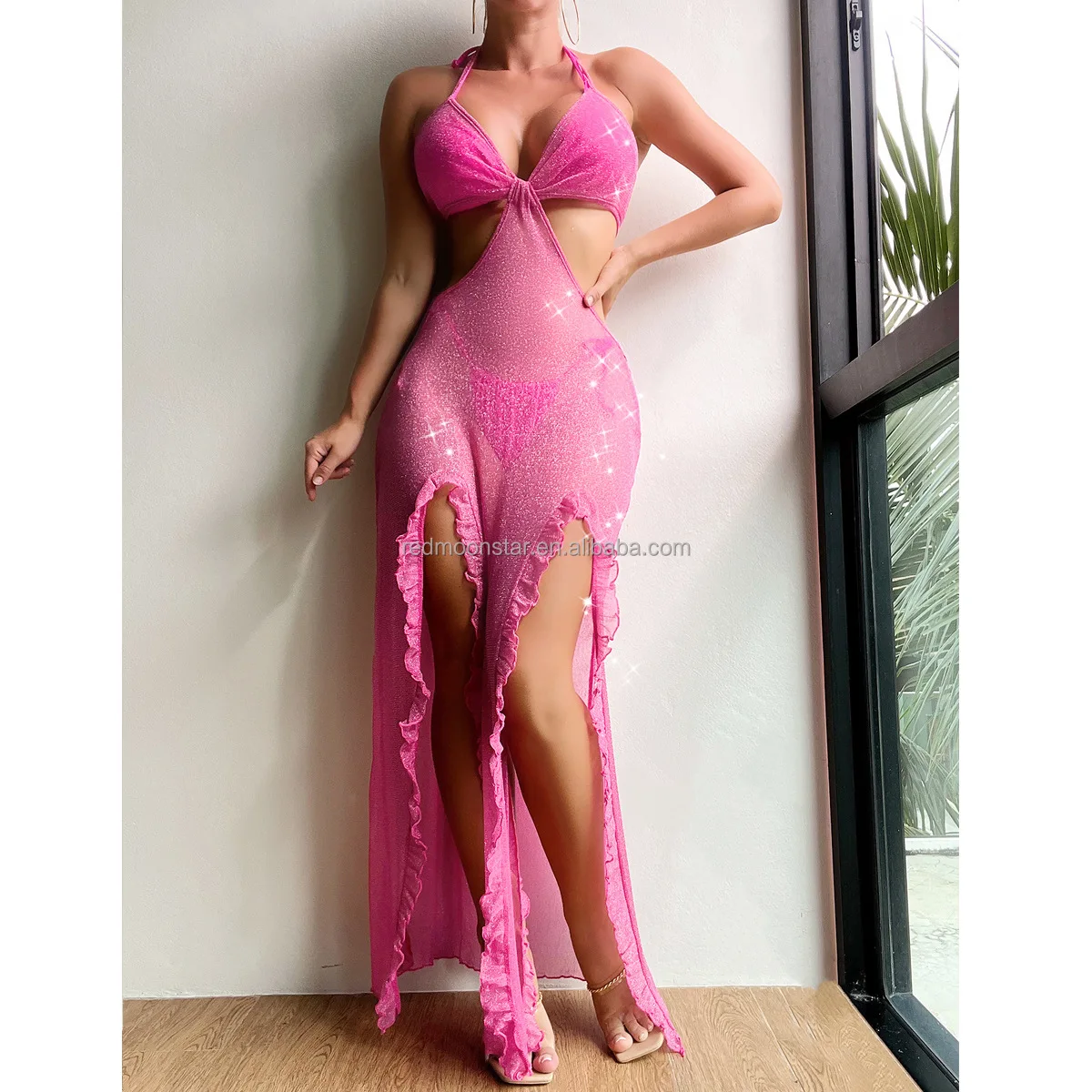 Wholesale custom sleeveless summer holiday beach skirt irregular lace ear edge hollowed out waist slim bikini cover dress skirt