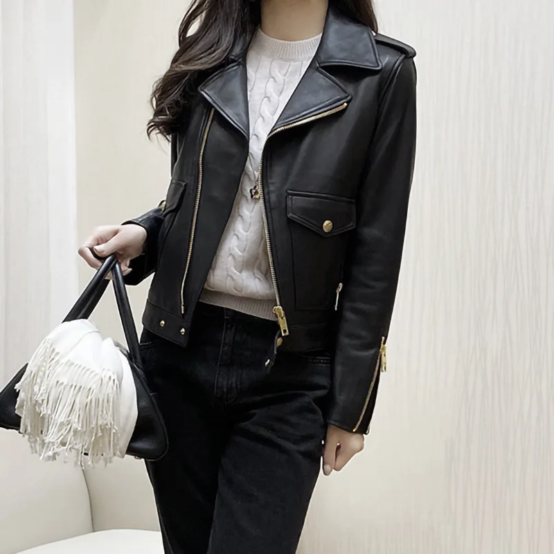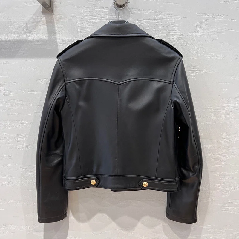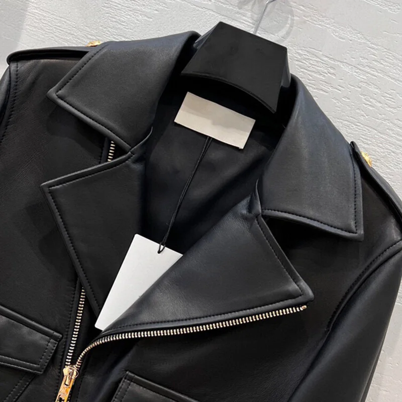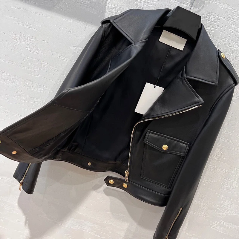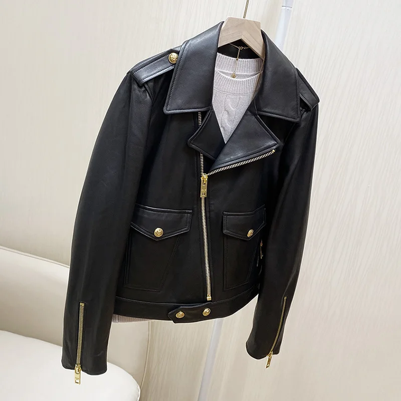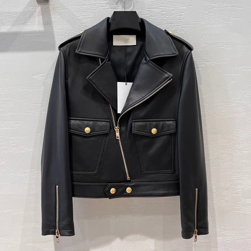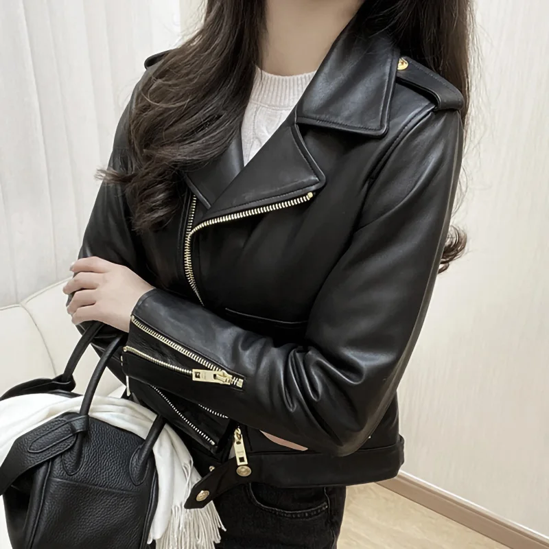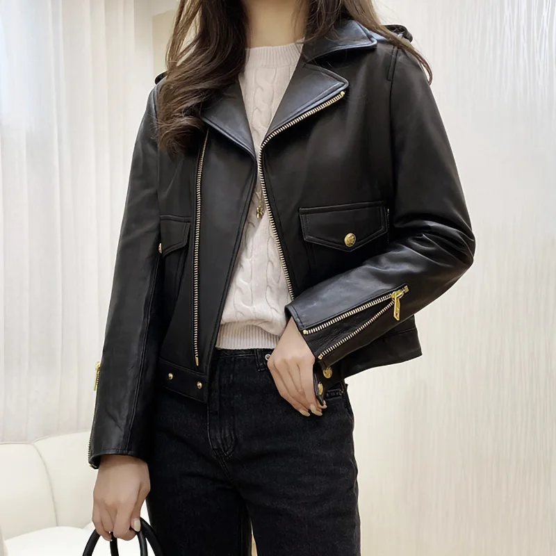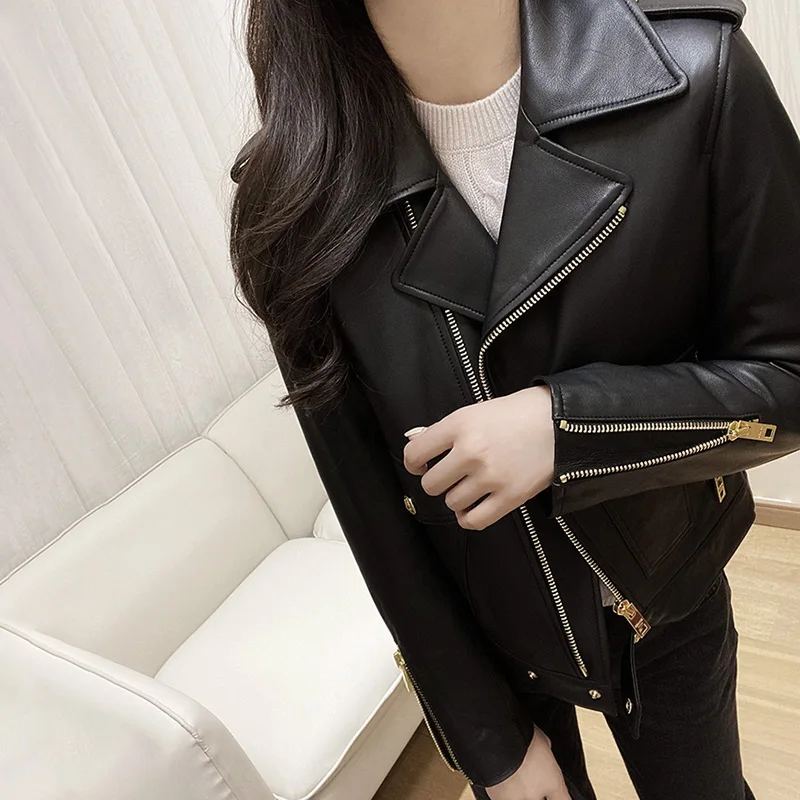 Wholesale Diagonal Zipper Black Motorcycle Leather Jacket Women Genuine Sheepskin Leather Jacket
