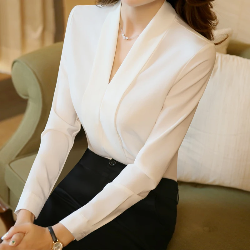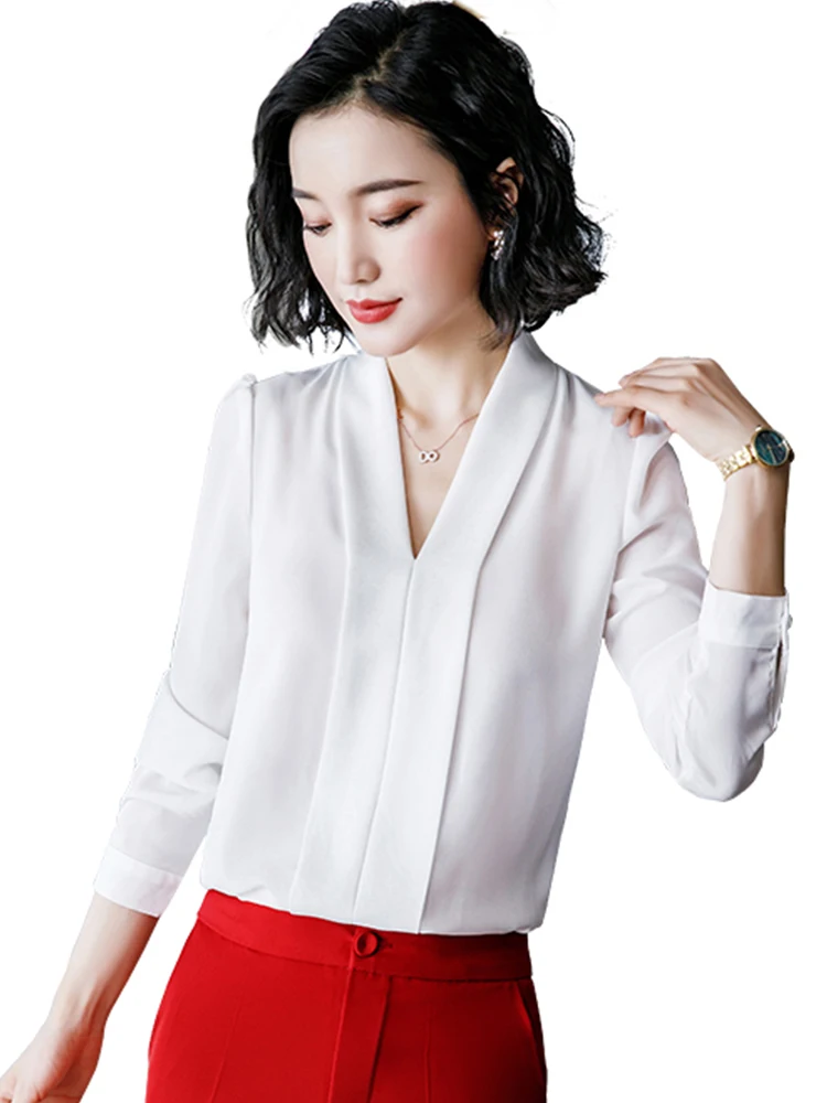 Wholesale Dropship Solid Loose Chiffon Shirt Breathable Soft V-neck Draped Blouse Women Wear Casual Style Office Lady Tops