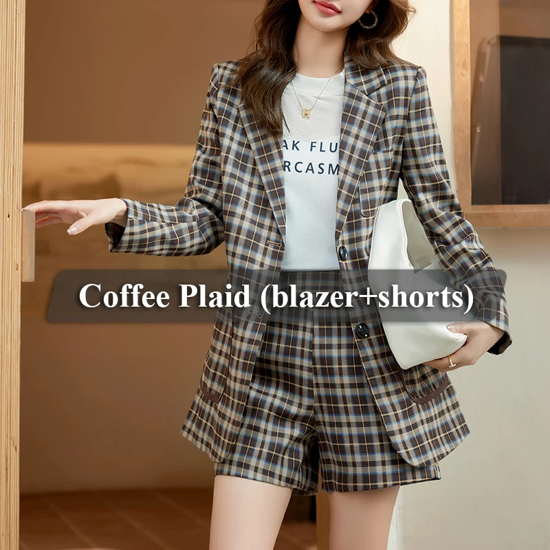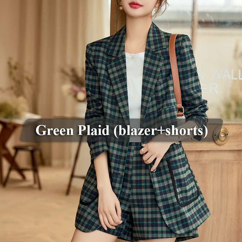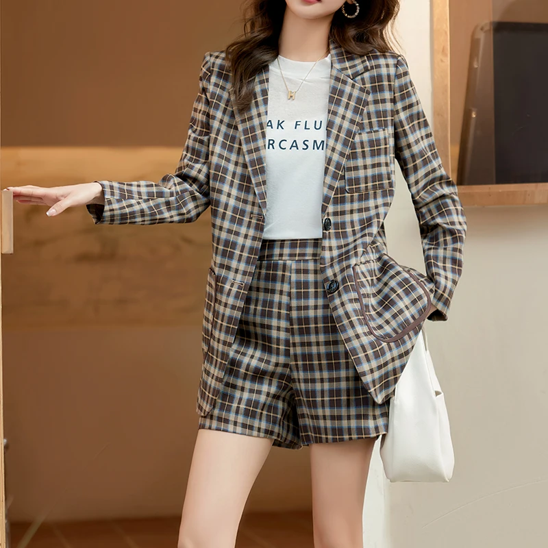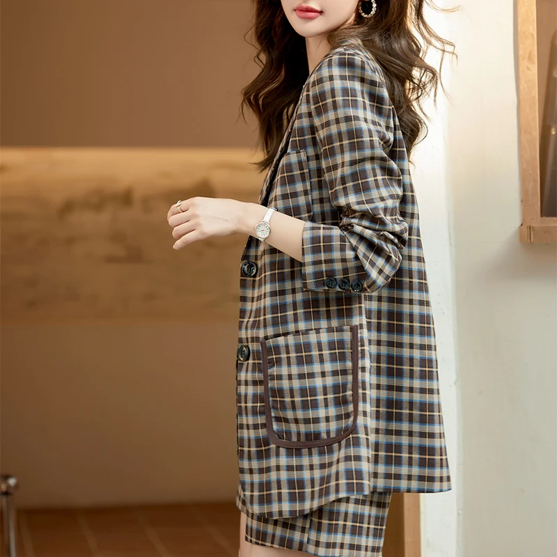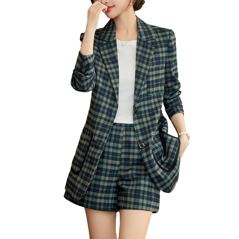 Wholesale High-quality 2 Piece Pant Set Formal Business Suit Plaid Blazer with Pockets Office Lady Women Jacket and shorts