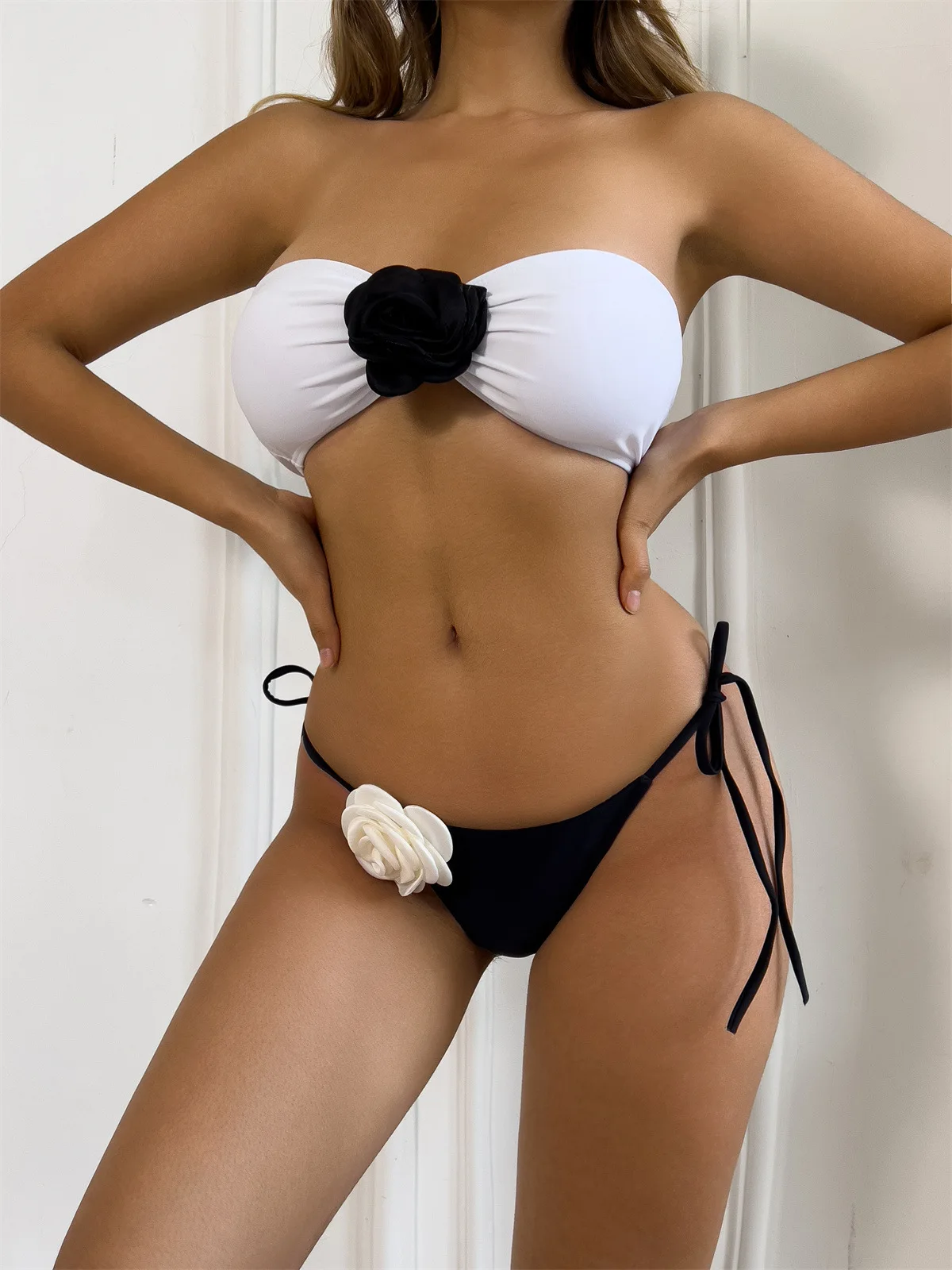 Wholesale high quality off-shoulders swimsuits hot sale 3D flowers bandage beach bikinis custom LOGO and swimwear