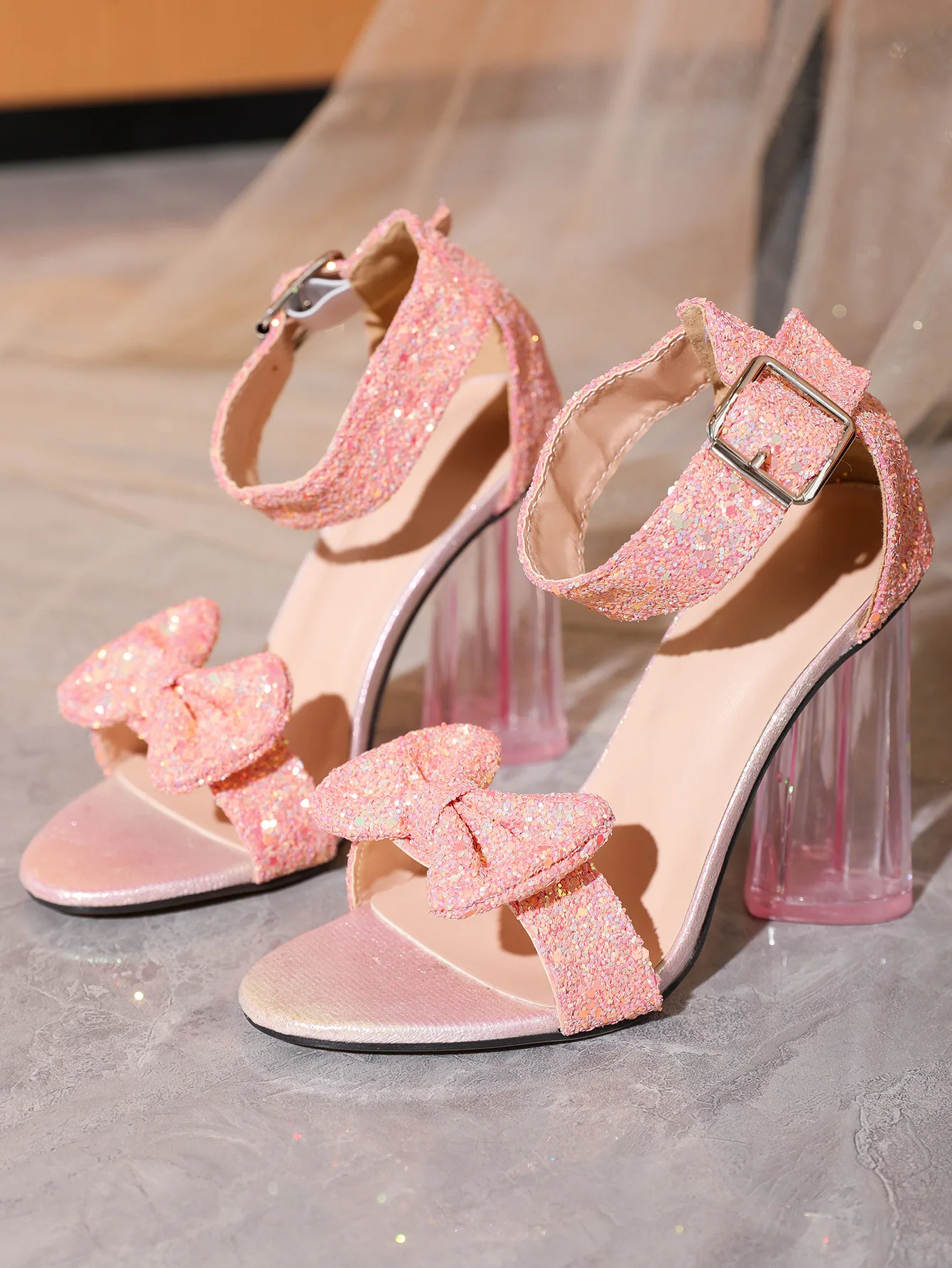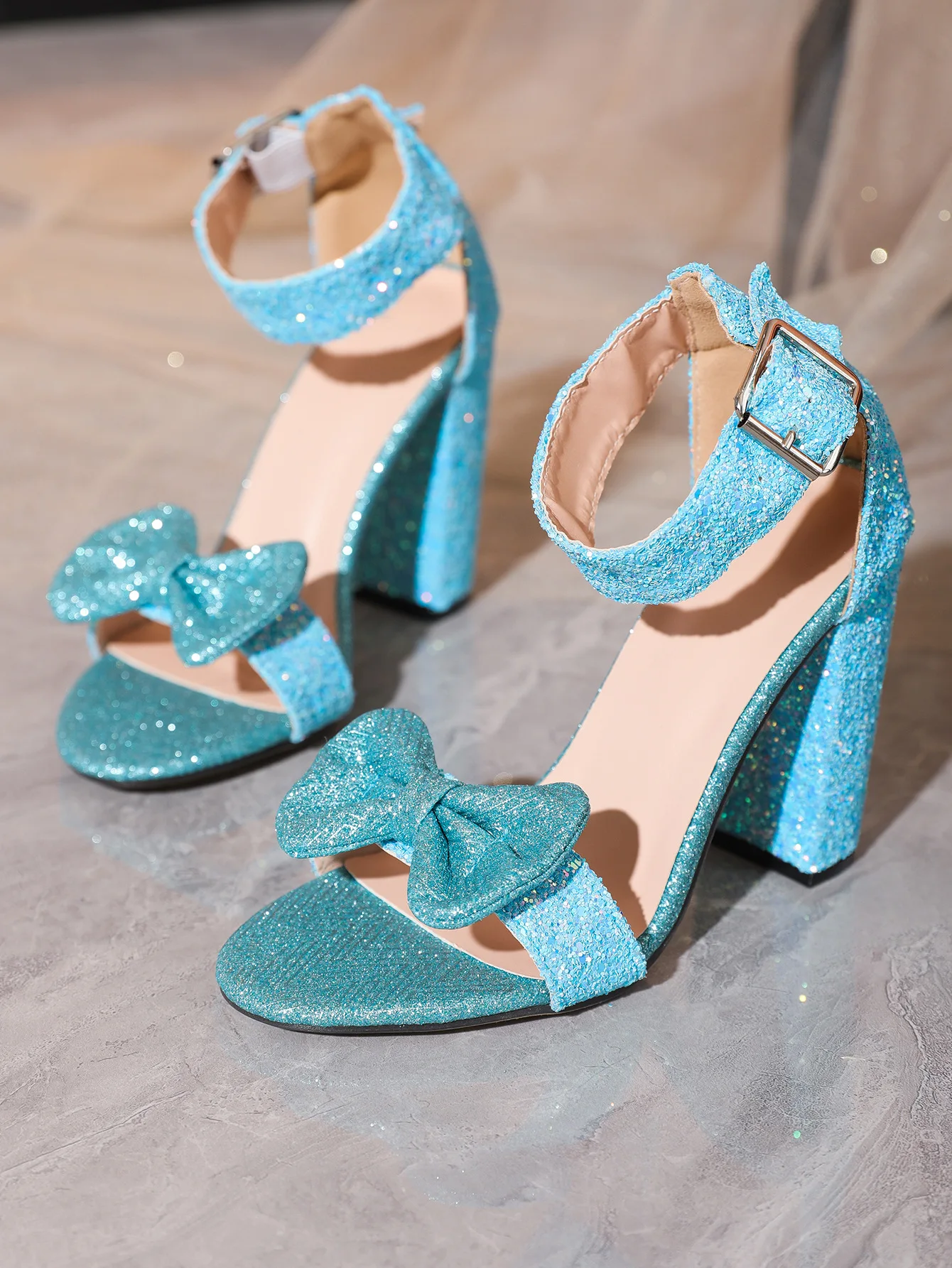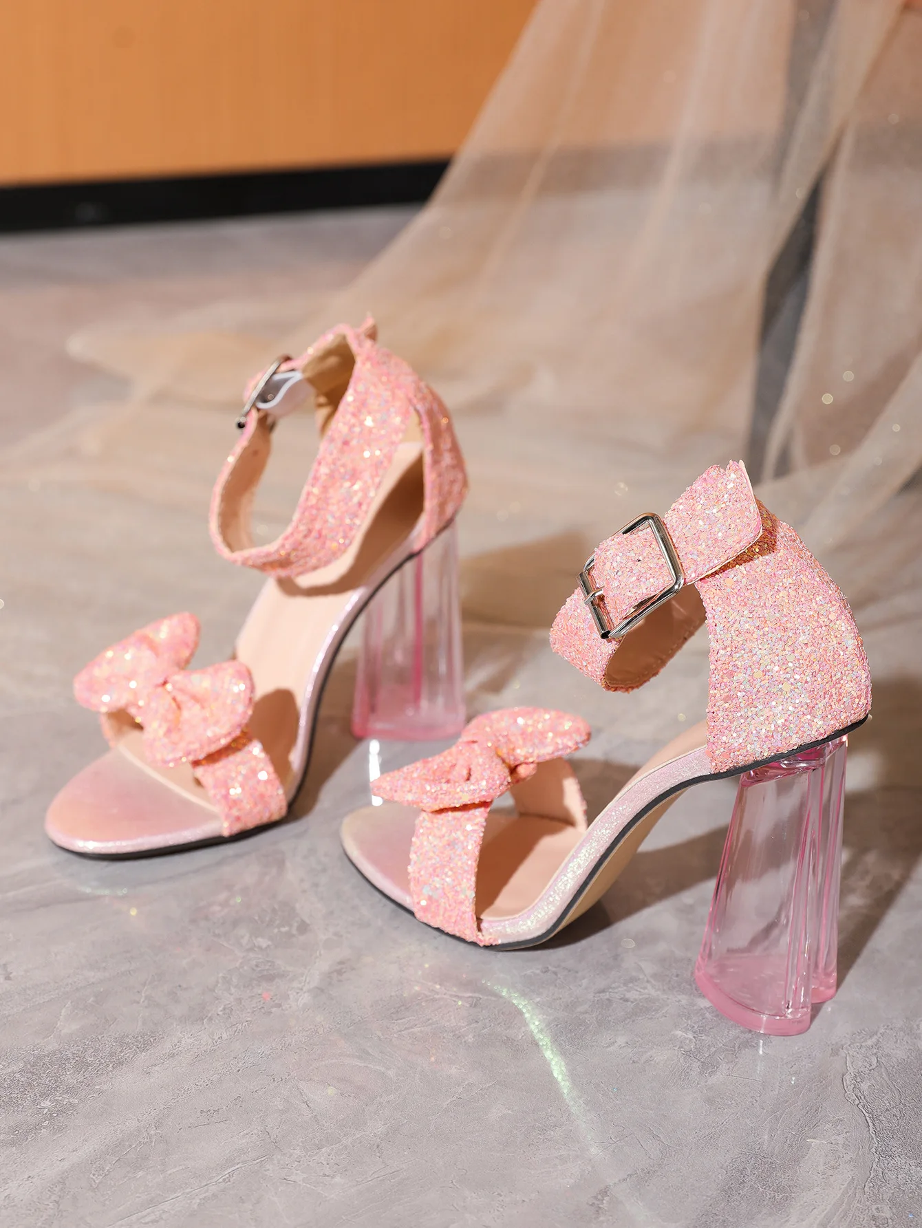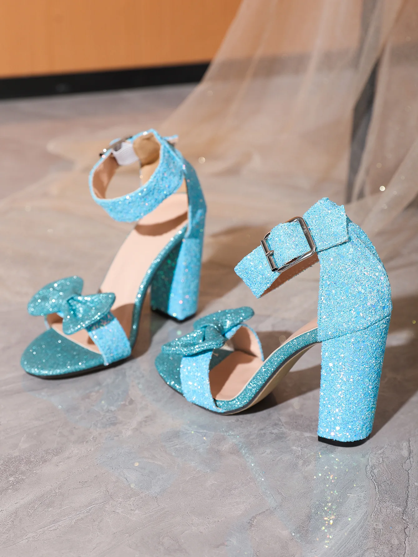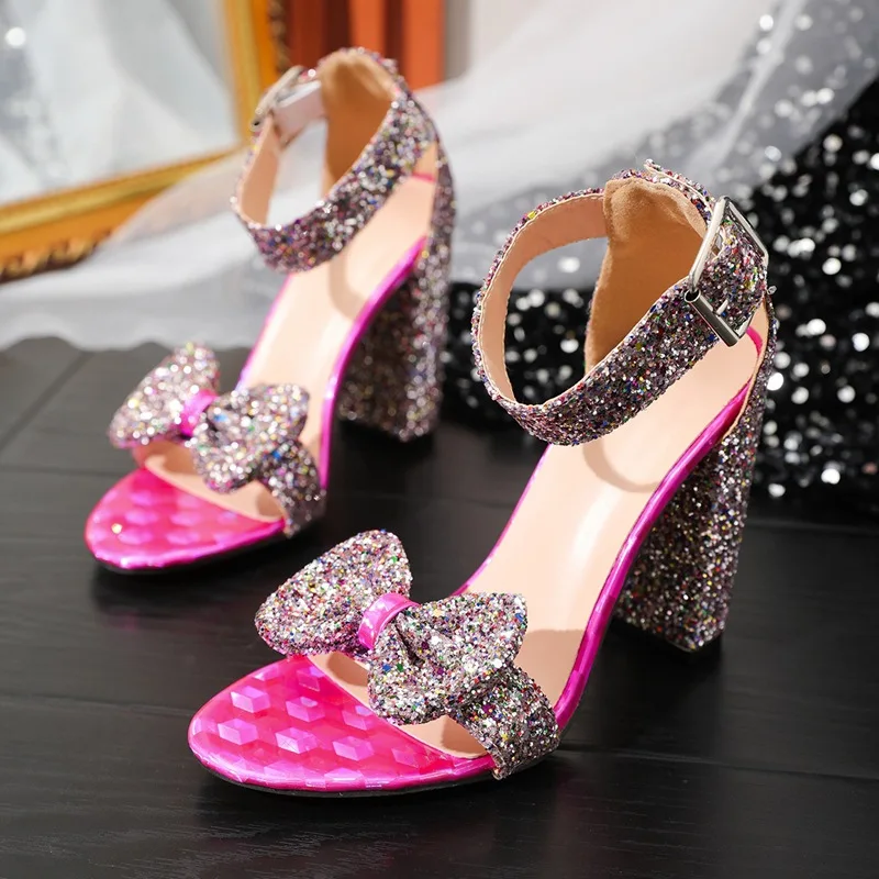 Wholesale New Sandalias 10CM Sequined Bow High heel Thick Heel Sandals Luxury Women Shoes Lace Up Heels for Women