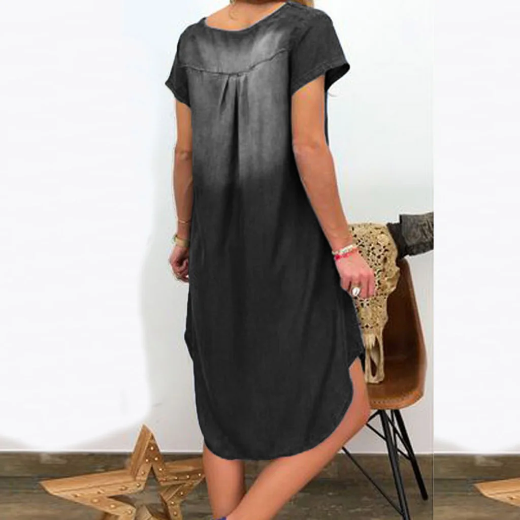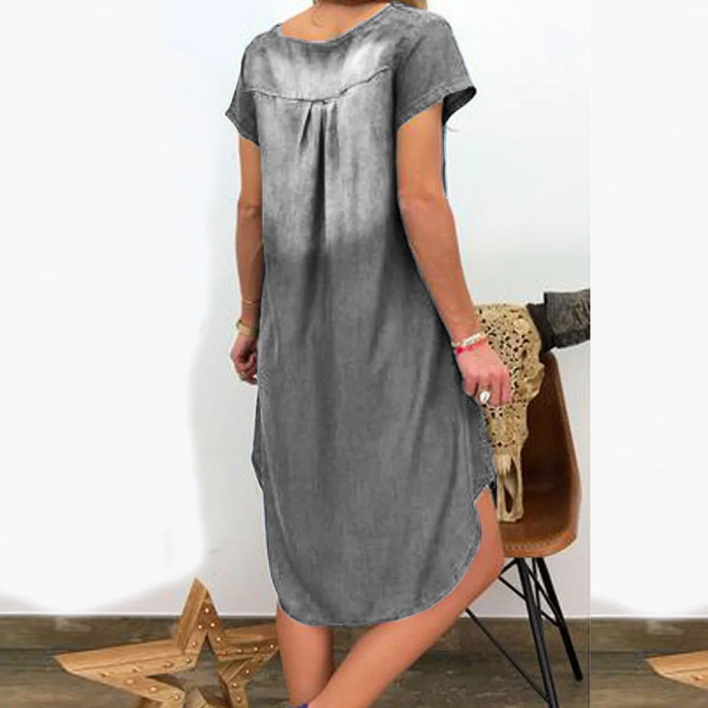 Wholesale Simple Ladies Summer New Casual Plus Solid Color V-Neck Short Sleeve Denim Women's Dress