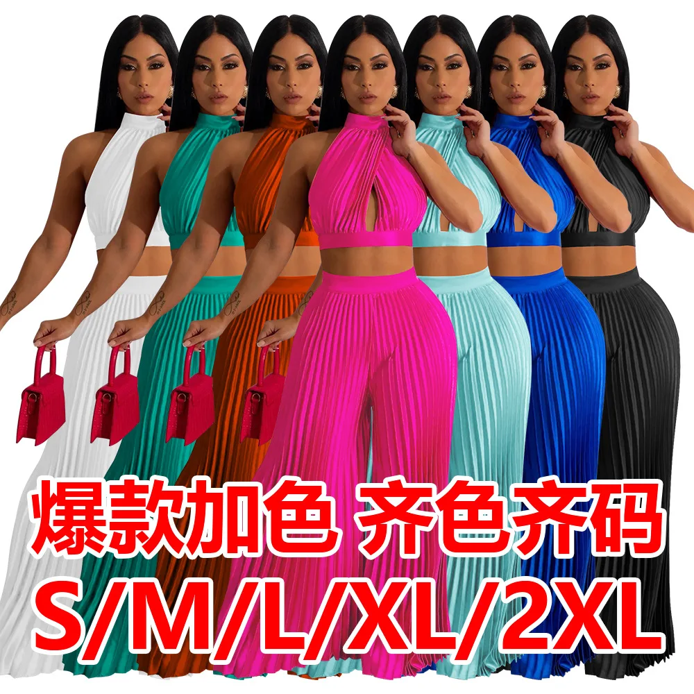 Wholesale Solid Color Crop Top & Trousers Two Pieces Pants Set Women Halter Neck Backless Silk Pleated Wide Leg Pants Set
