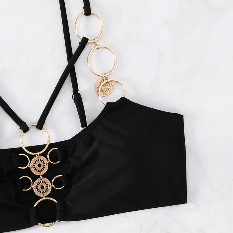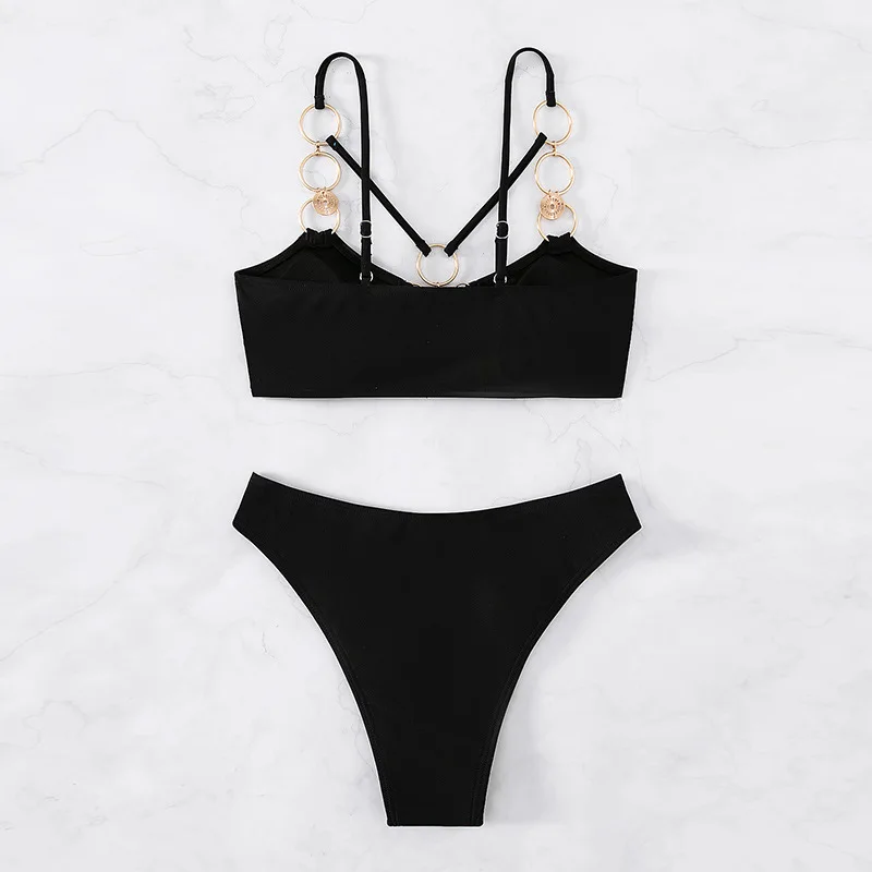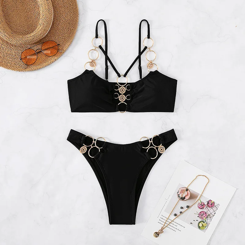 Wholesale Summer Beach Women Sexy Bikini Metal Ring Swimsuits Hollow Out Bathing Suit 2 Pieces Black Swimwear 2023 Summer
