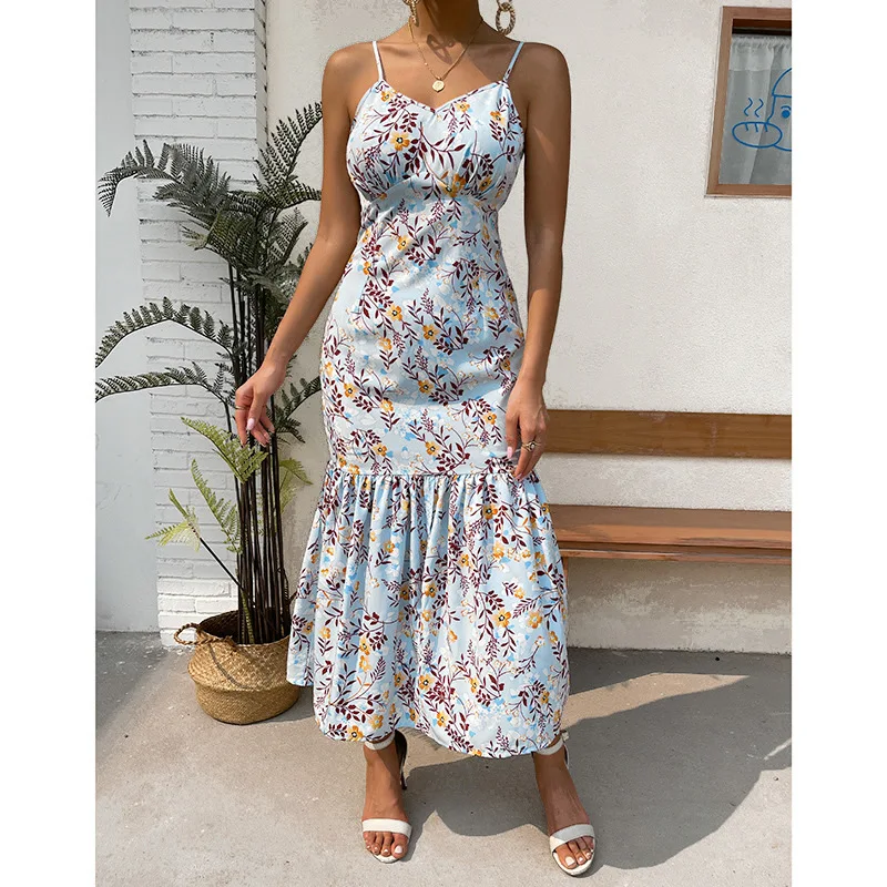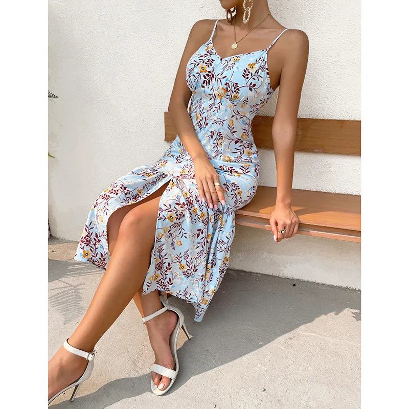 Wholesale summer boho sun dress 2022 ruffle hem slit slip floral long casual dresses women