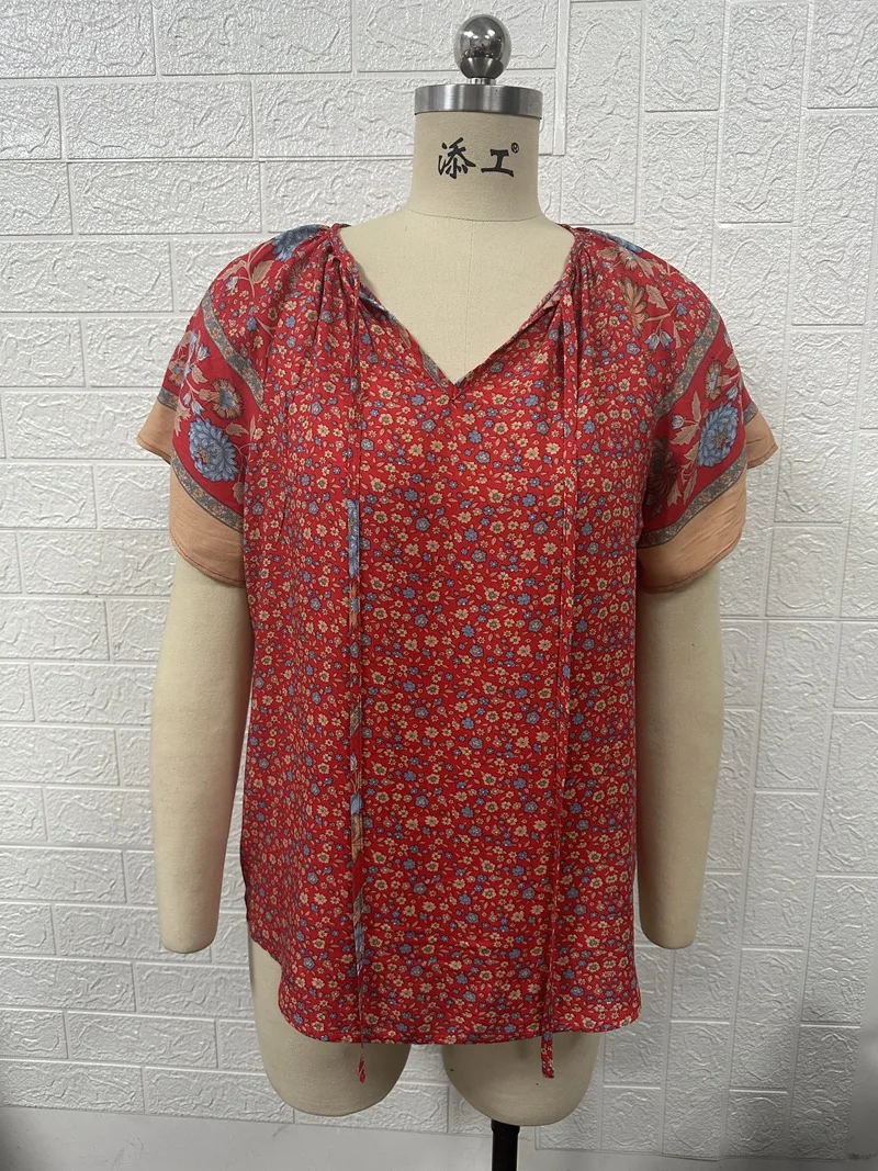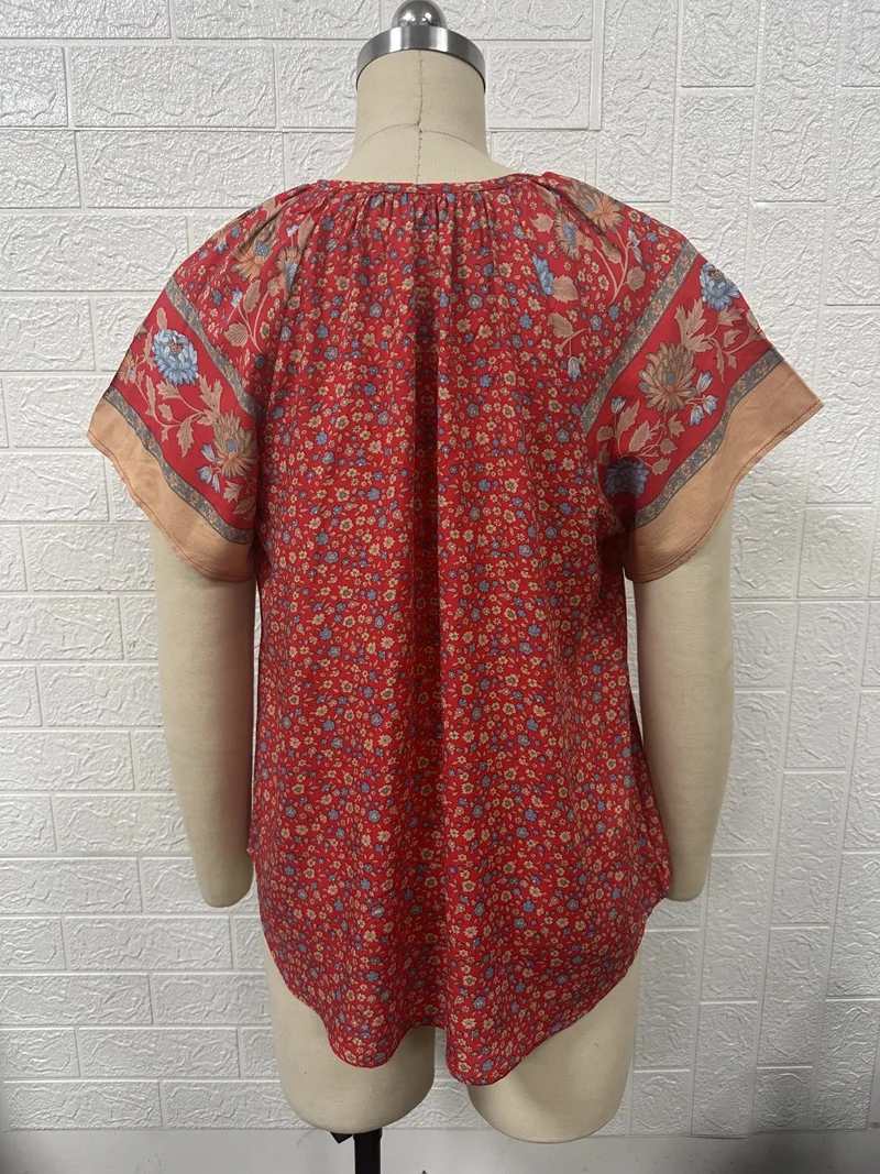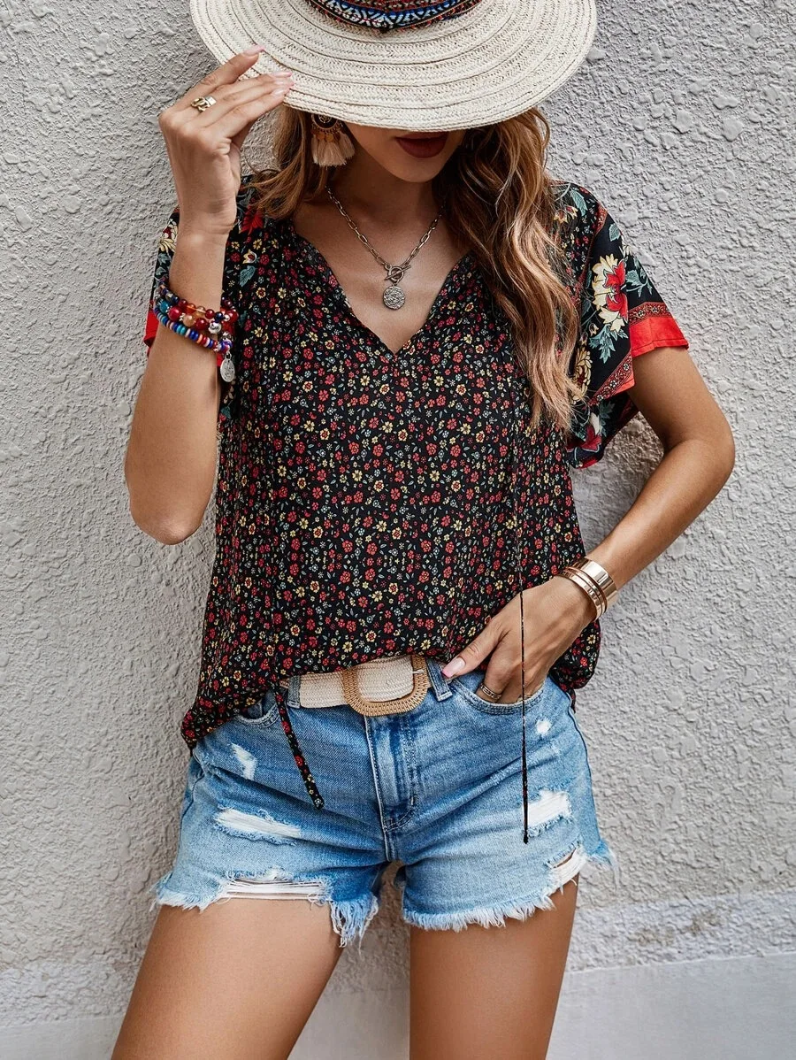 Wholesale Summer Vintage Outfits Petal Sleeve Print Woman Tops Fashionable Elegant Blouses Womens T-Shirt
