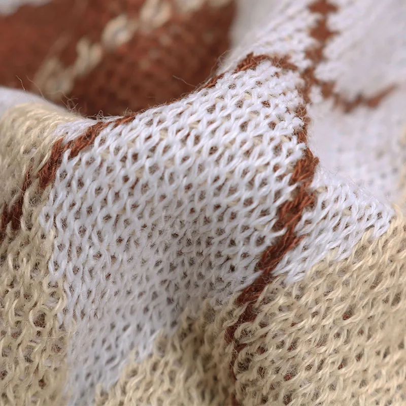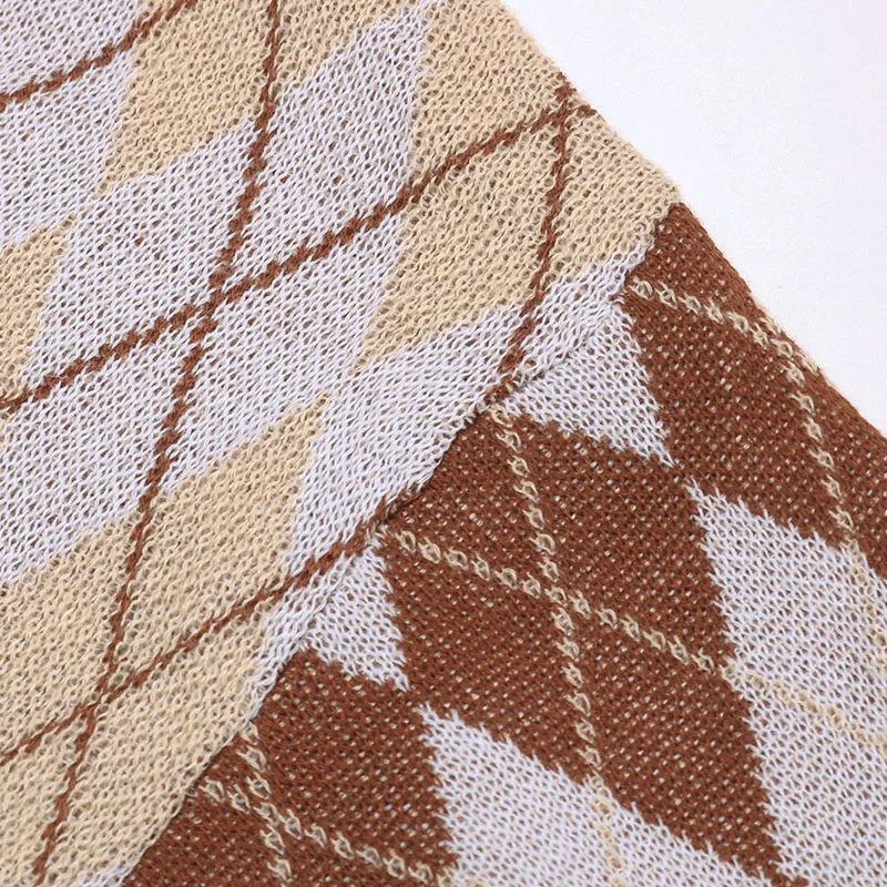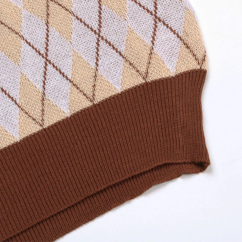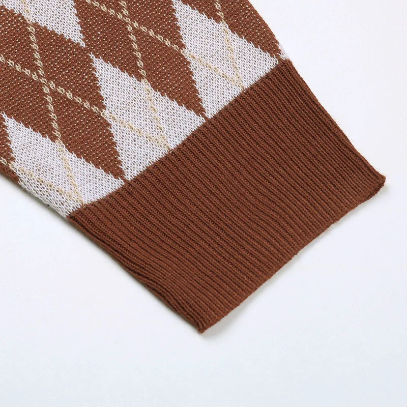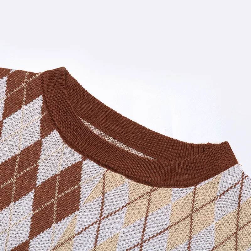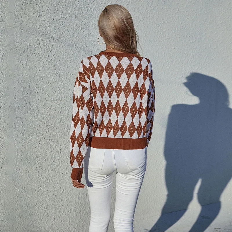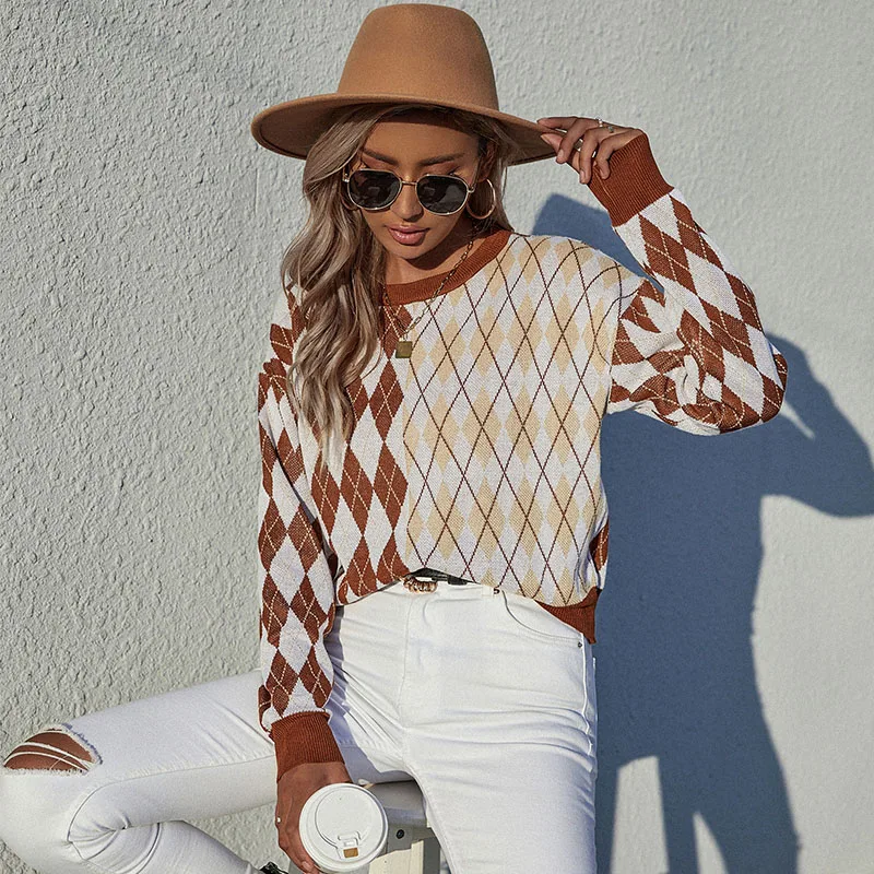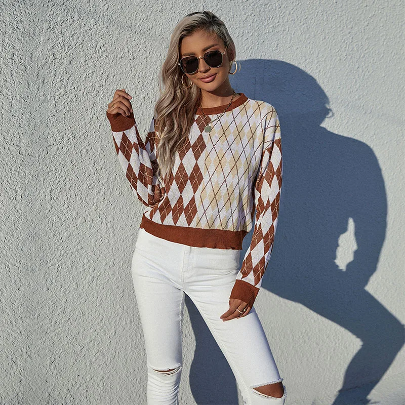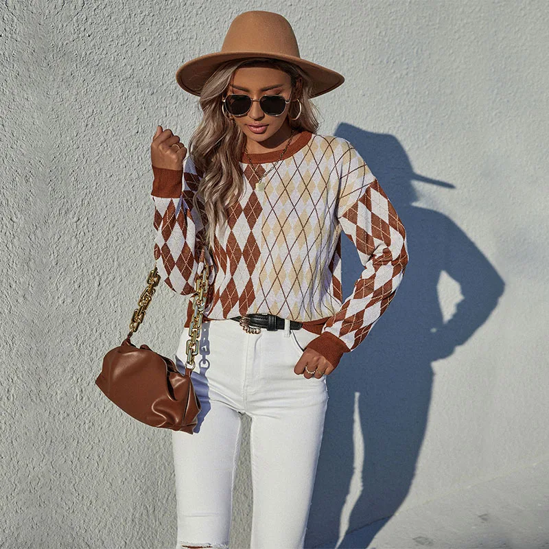 Wholesale Trendy Color Splicing Argyle Knitted Top Crew Neck Long Sleeve Pullover Sweater