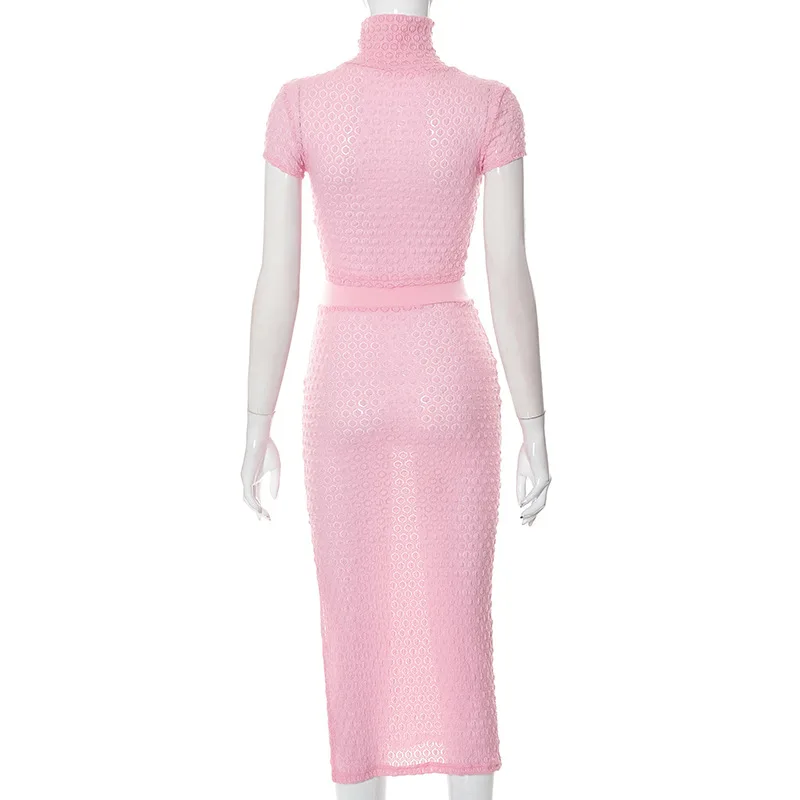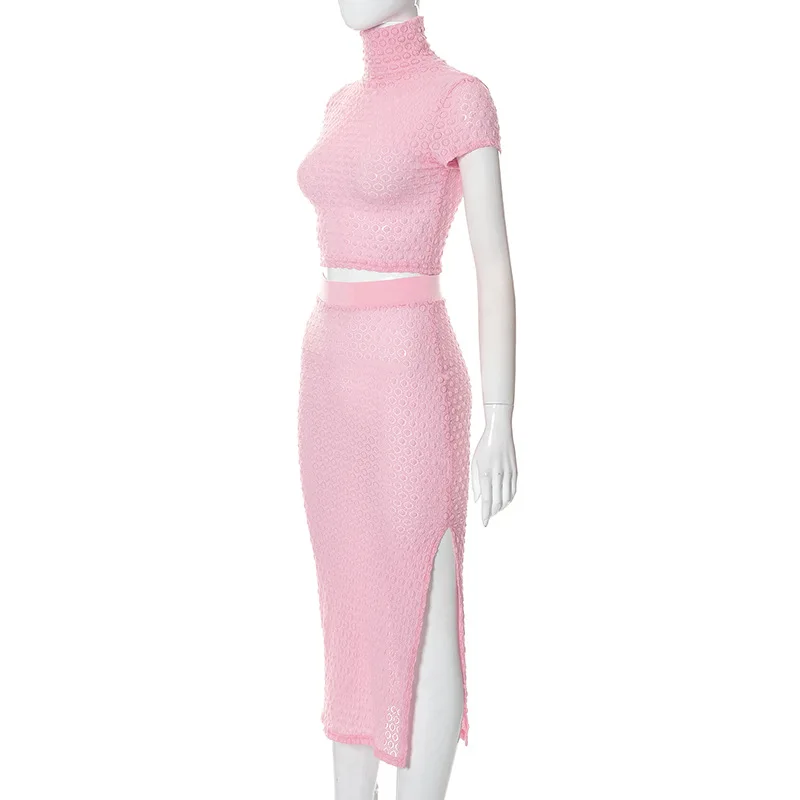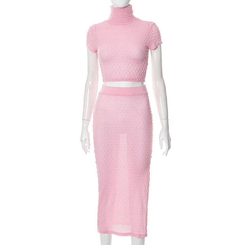 Wholesale trendy ladies sexy high neck short sleeve crop top and midi skirt set for women outfits two piece set clothing