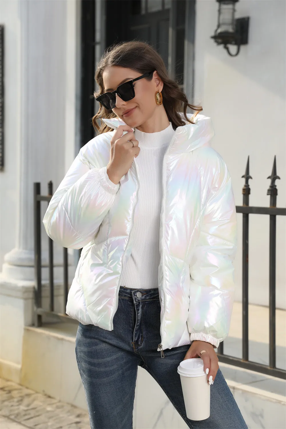 Wholesale winter zipper casual warm coat fashion cropped shiny puffer down jacket women
