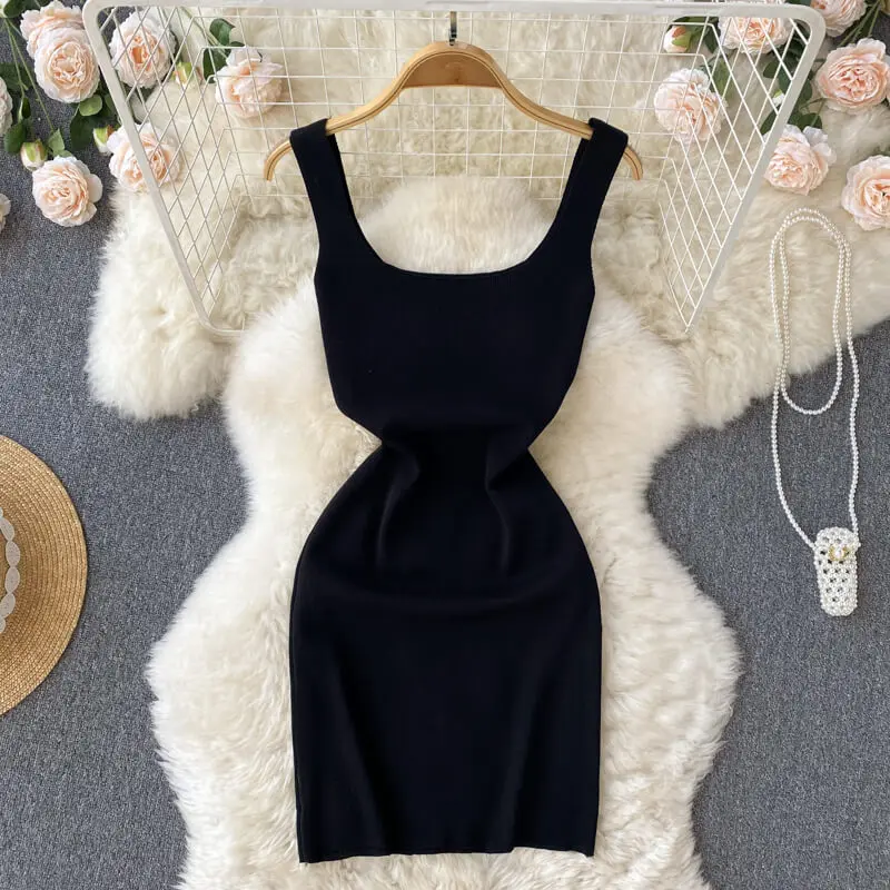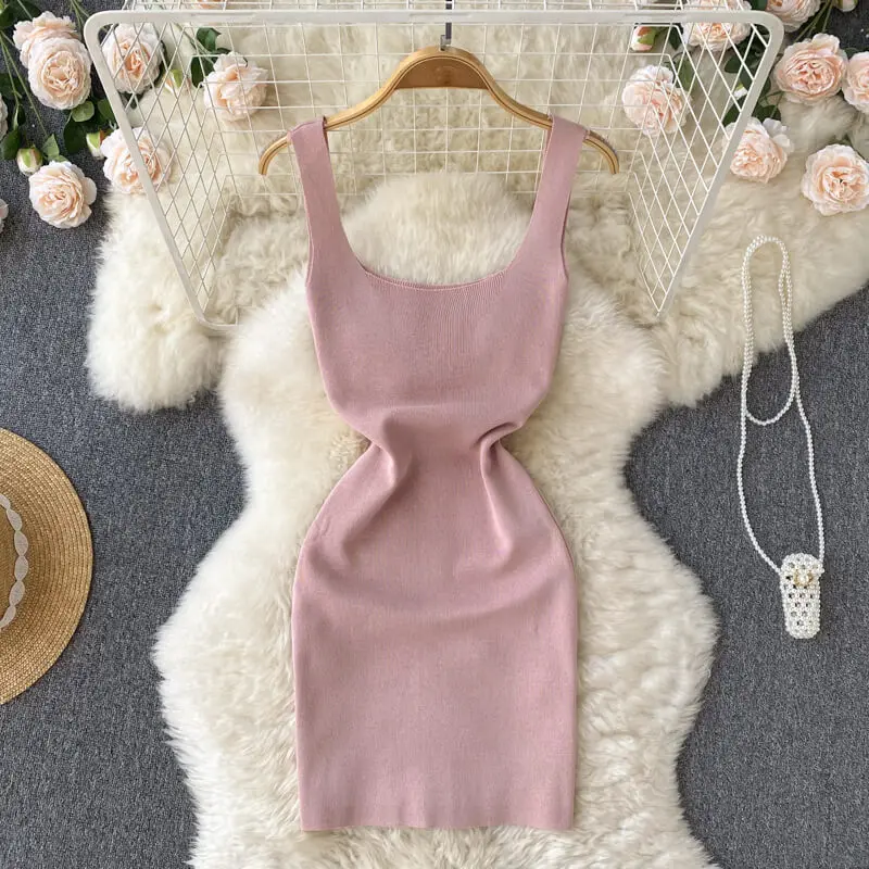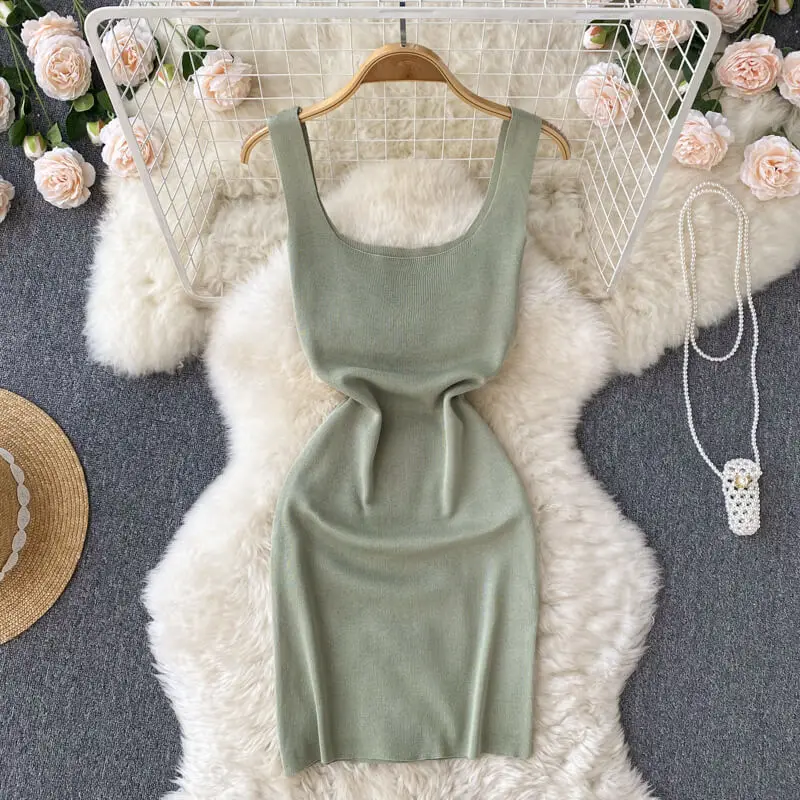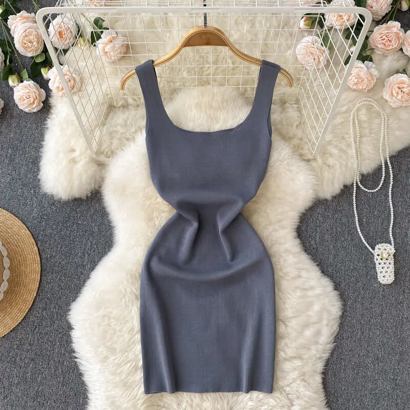 Wholesale Womens Solid Color Boat Neck Simple Knit Sleeveless Mini Sheath Casual Dresses