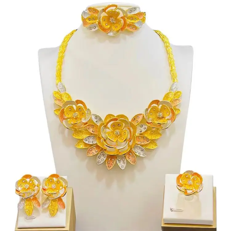 Wholesale14K Gold Indian Jewelry Set Lady Bridal Wedding Fashion Jewelry Necklaces Ring Bracelet Earrings