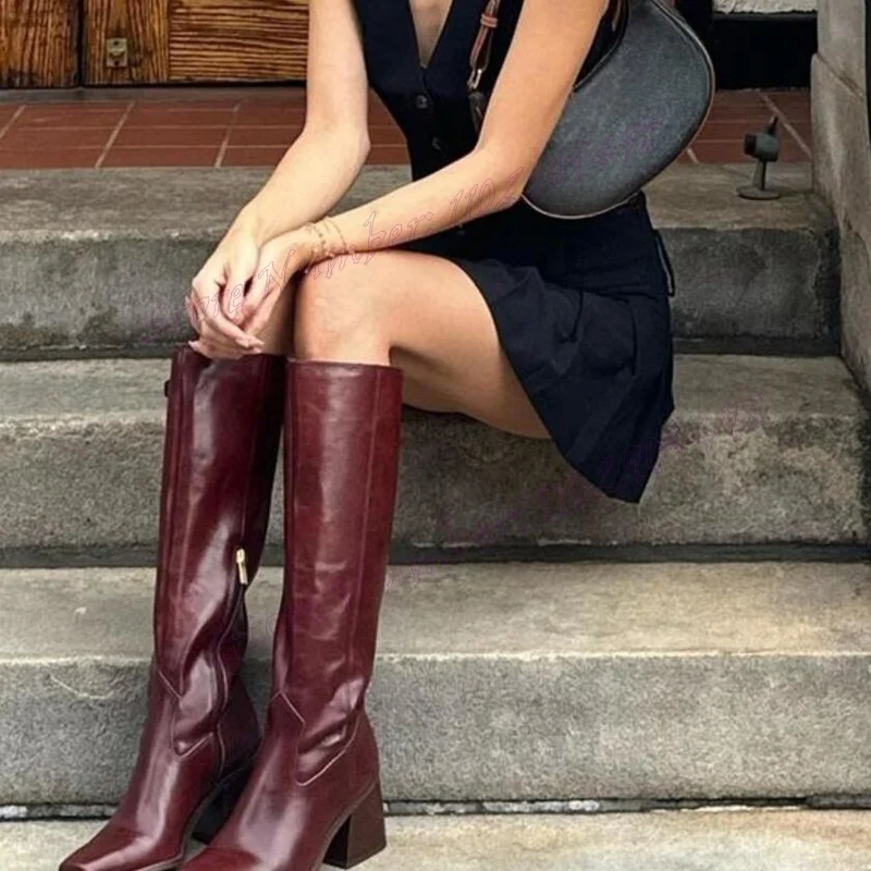 Wine Red Chunky Heels Boots Matte Leather Side Zipper Shoes for Women Knee High Sexy Lady Party Shoes 2025 Zapatos Para Mujere