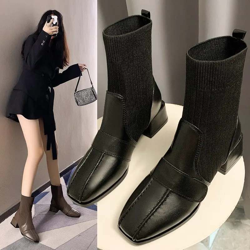 Winter ladies British Wind Women's Middle cylinder short boots chunky heel Thick bottom black platform socks leather ankle shoes