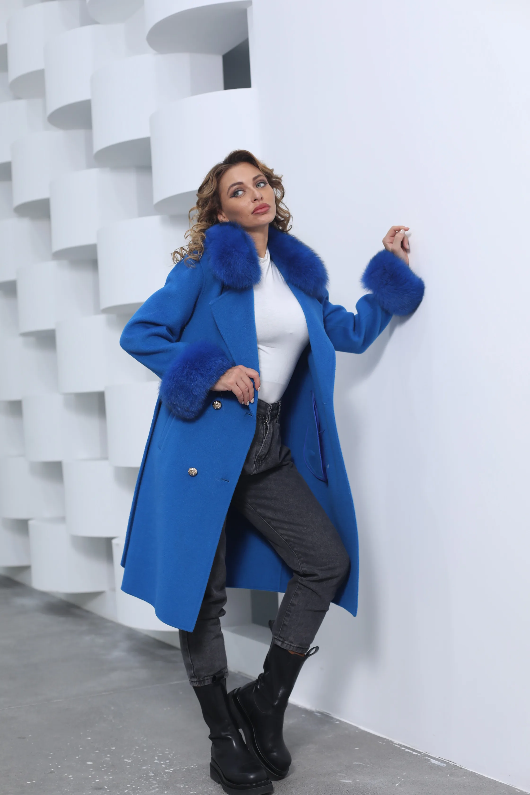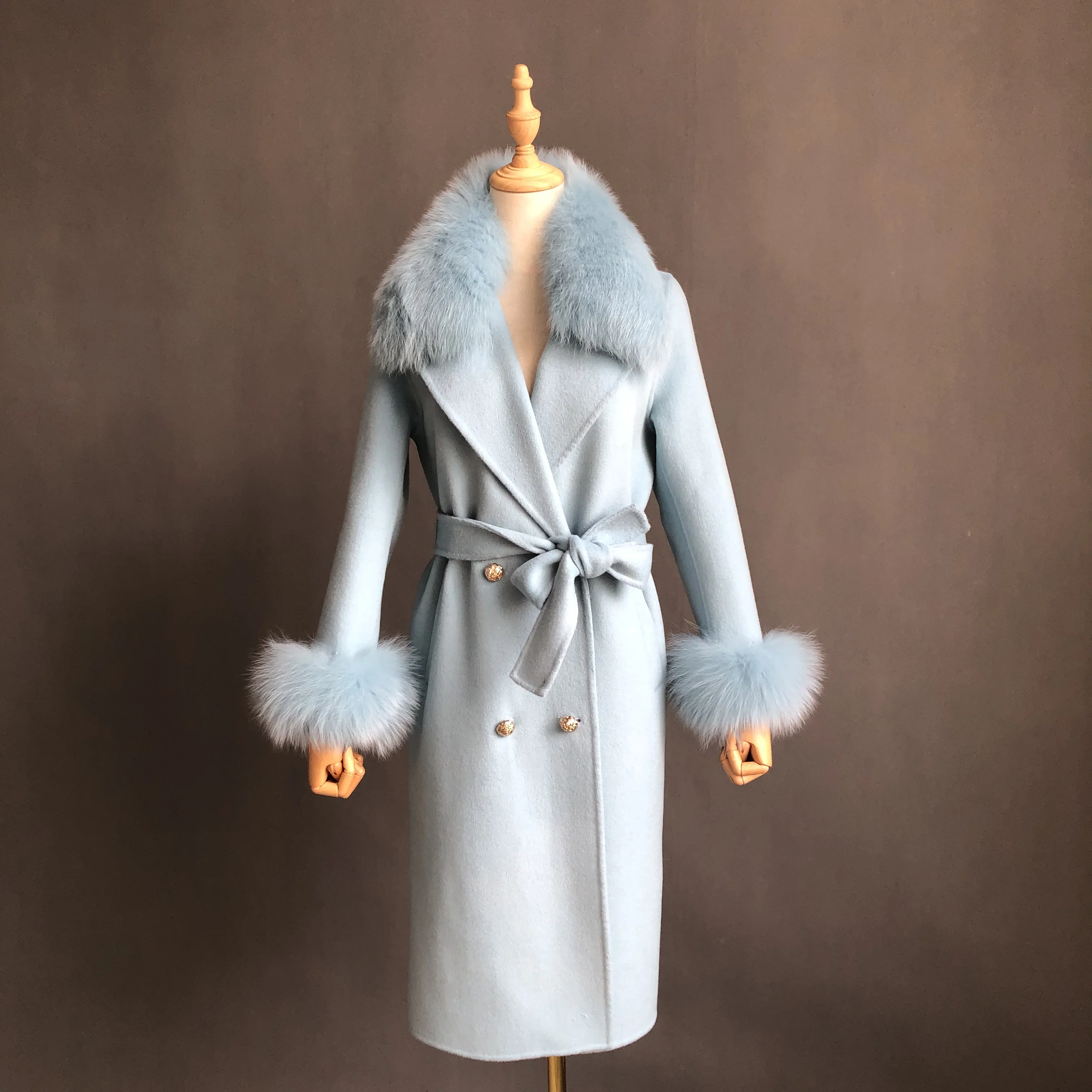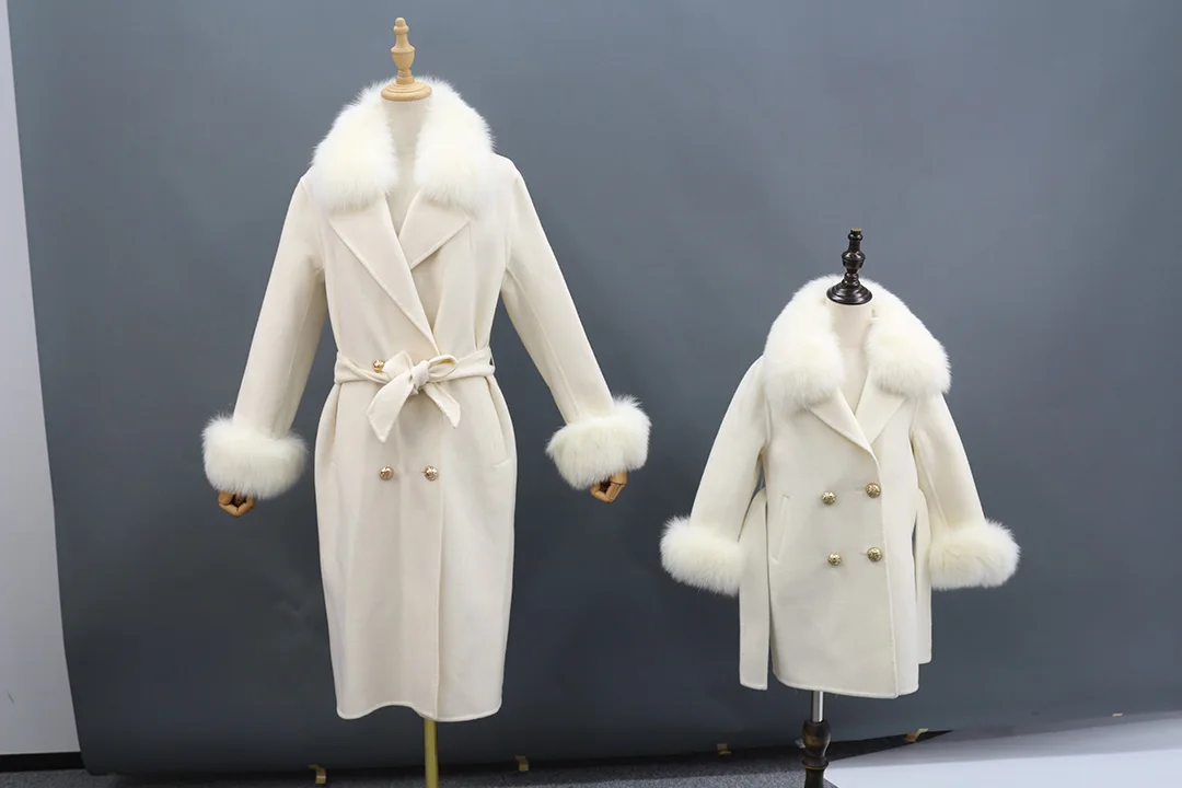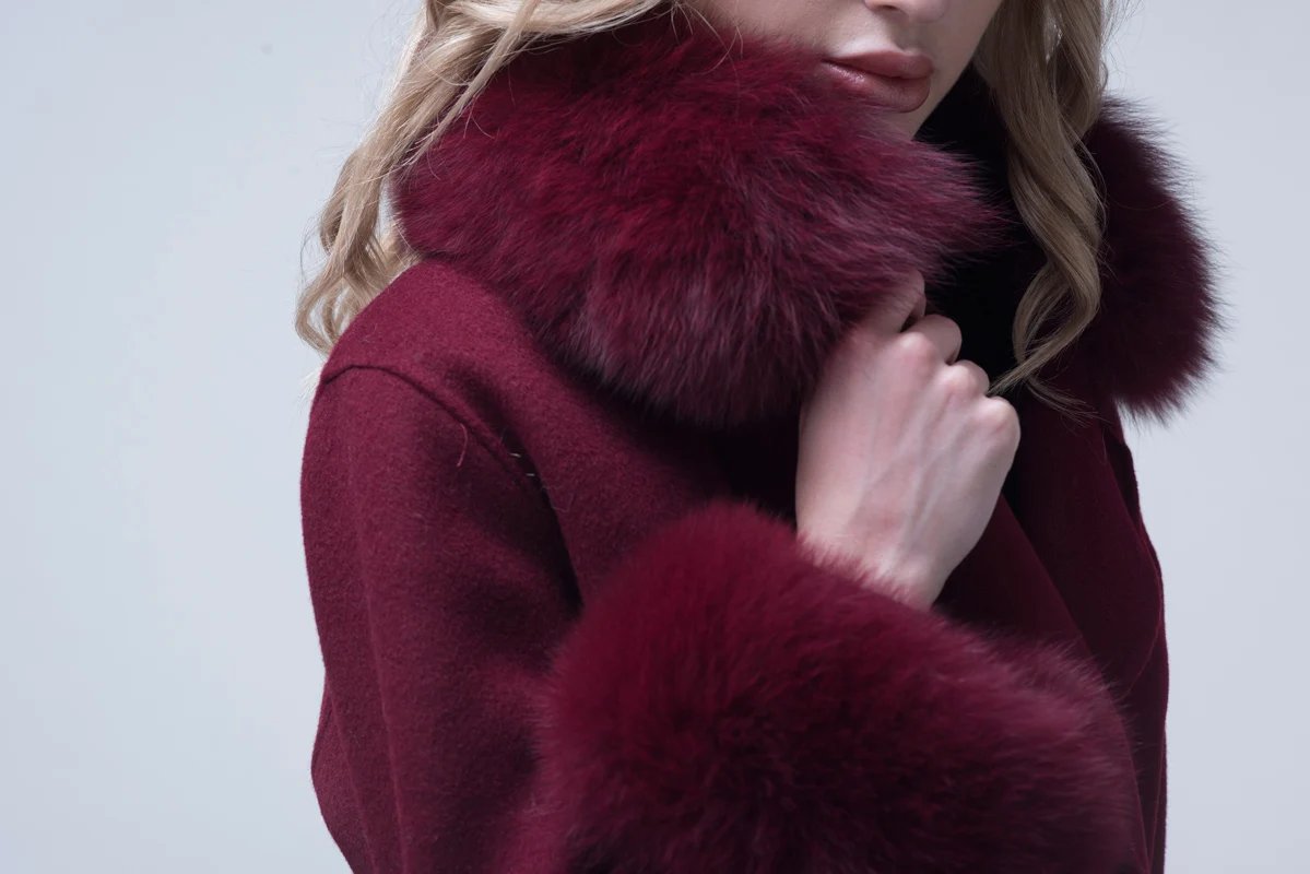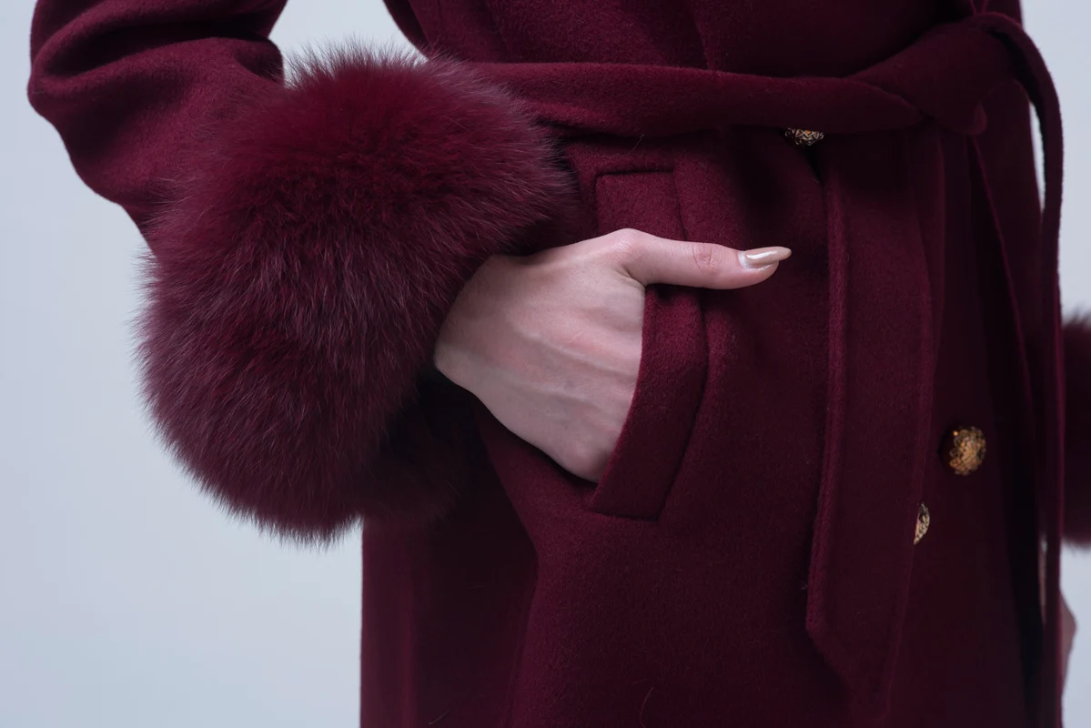 Winter Trend Real Fox Fur Collar Cashmere Wool Coat with Fur Cuffs