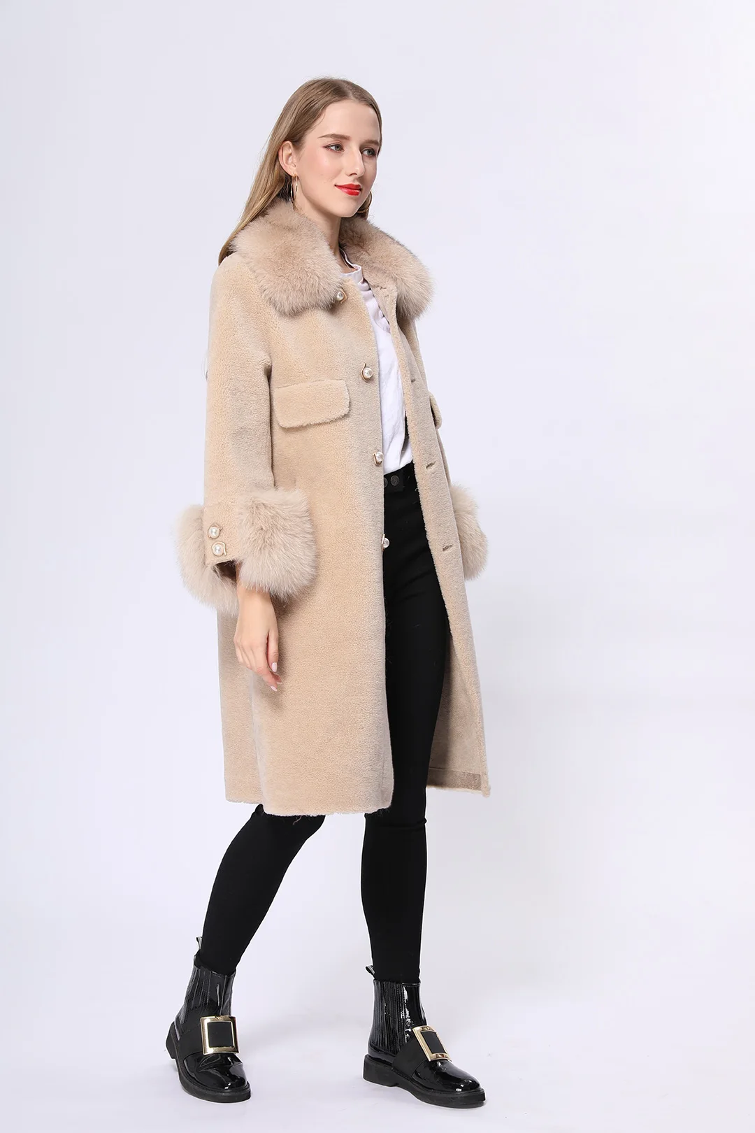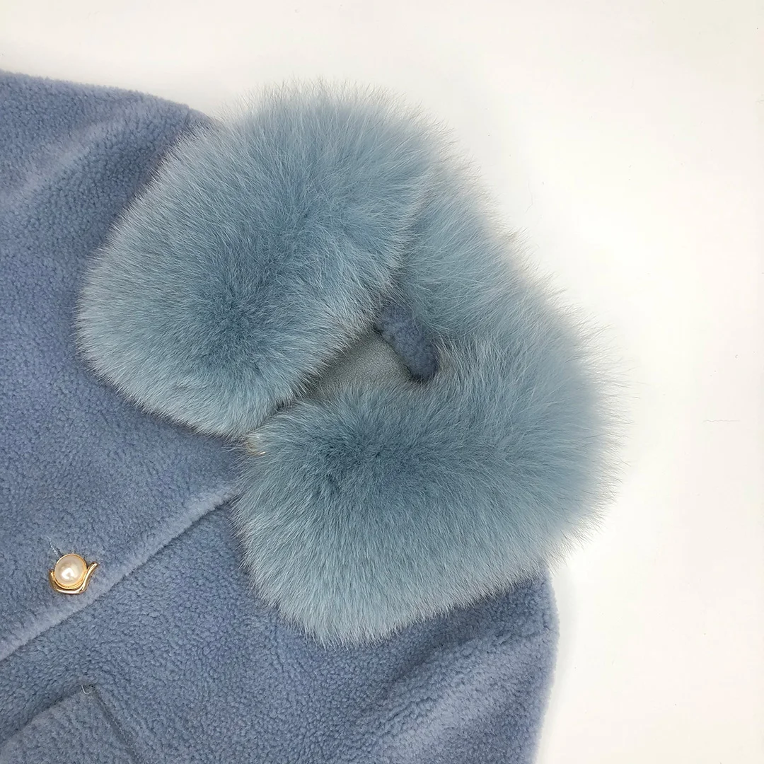 Winter warm genuine fox fur collar and cuff women real sheep shearling coat
