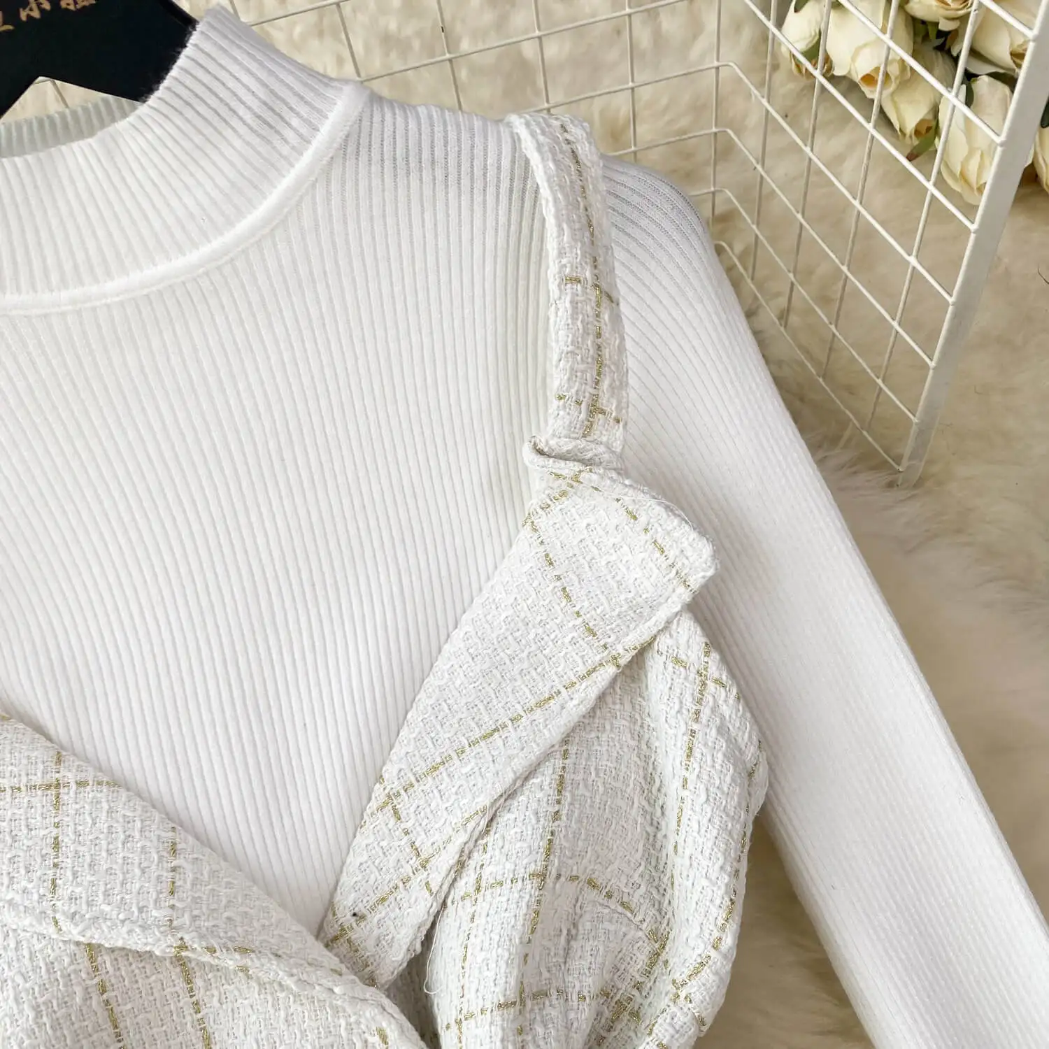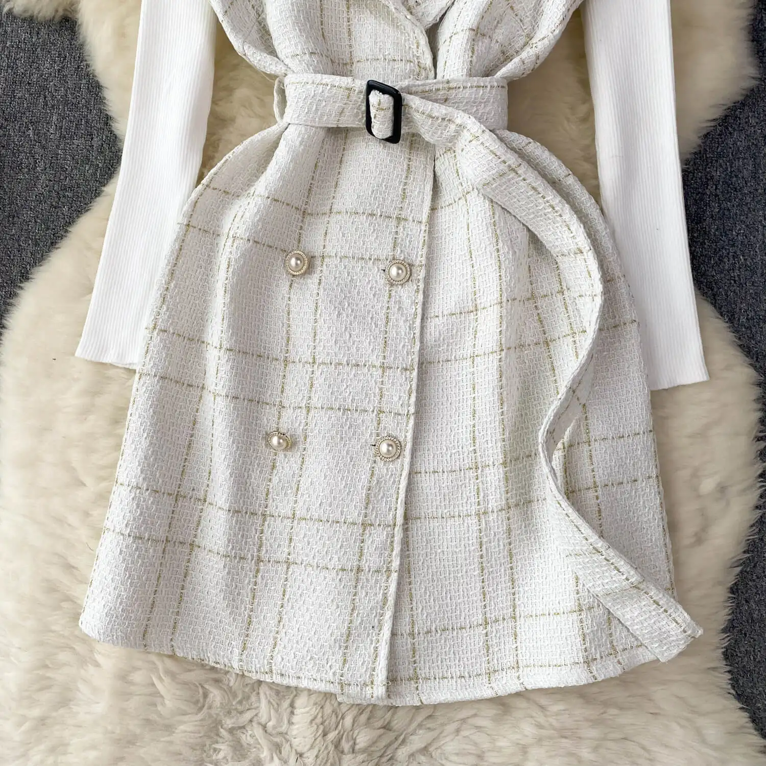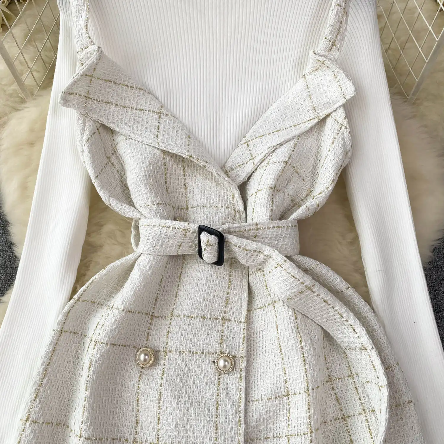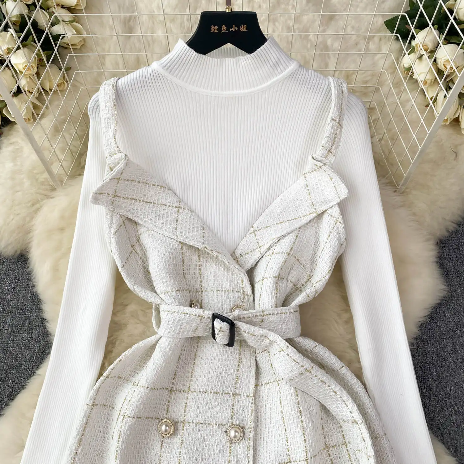 Women A Line Tweed Plaid Spaghetti Straps Dress Two-piece Bottoming Sweater Female Knitted Dress Set