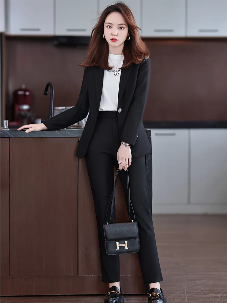 Women Blue Navy Black Formal Blazer Pant Suit Female Solid Jacket and Trouser 2 Piece Set For Office Ladies Winter Work Wear