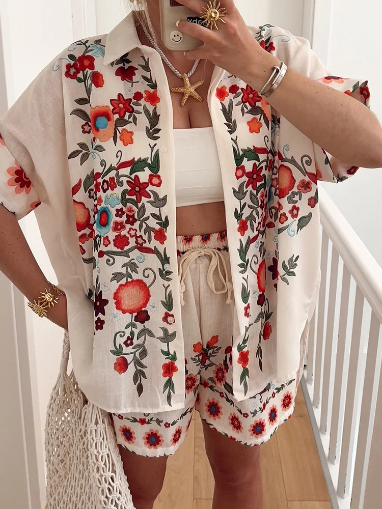 Women Cardigan Top Shorts Two Pieces Sets, Summer Holiday Fashion Half Sleeve Chic Outfit, 2025 Print Elastic Waist Ladies Suits